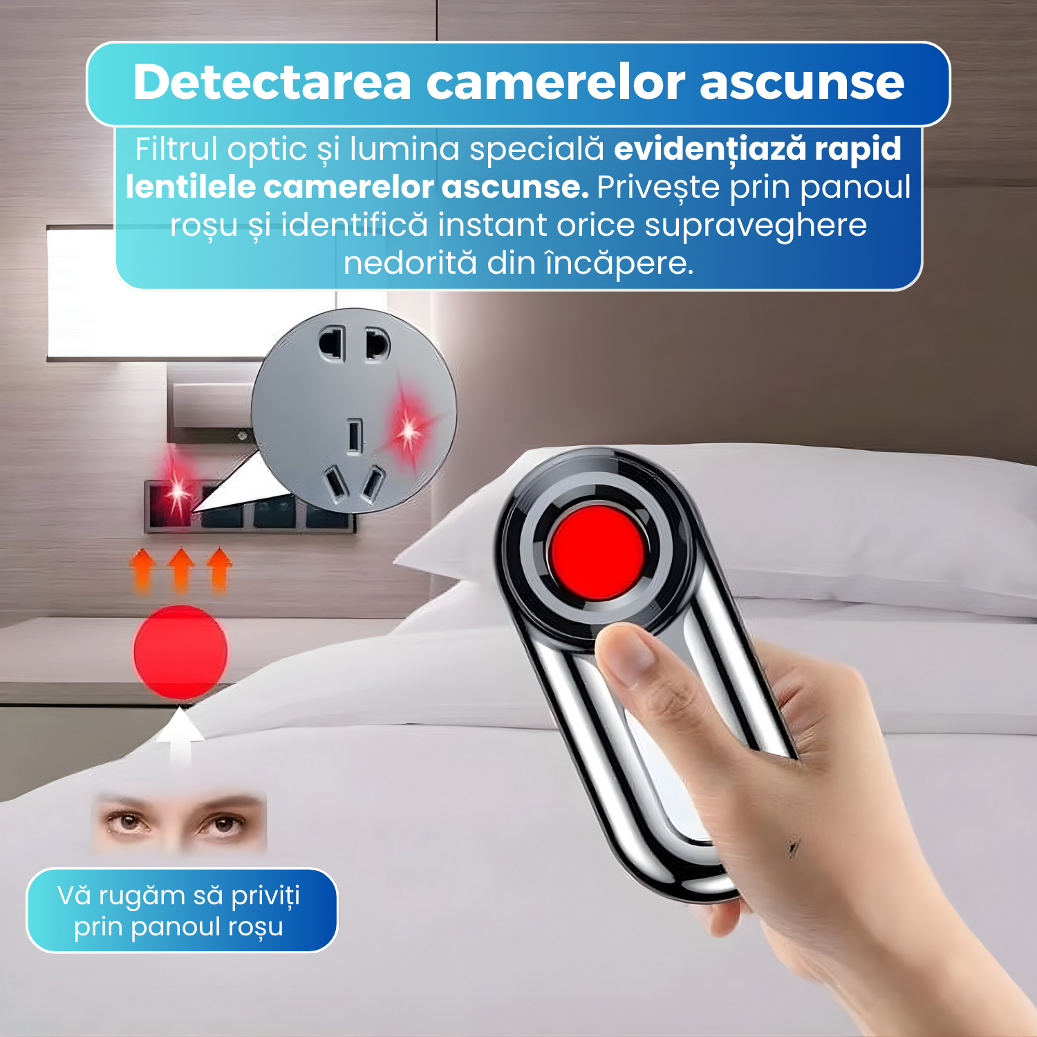 Dispozitivul utilizeaza lumina infrarosie si un filtru optic special pentru a evidentia lentilele camerelor ascunse, inclusiv cele miniaturale tip pinhole. Chiar si camerele mascate in obiecte comune pot fi identificate rapid prin reflexia specifica a lentilei, reducand semnificativ riscul incalcarii intimitatii.