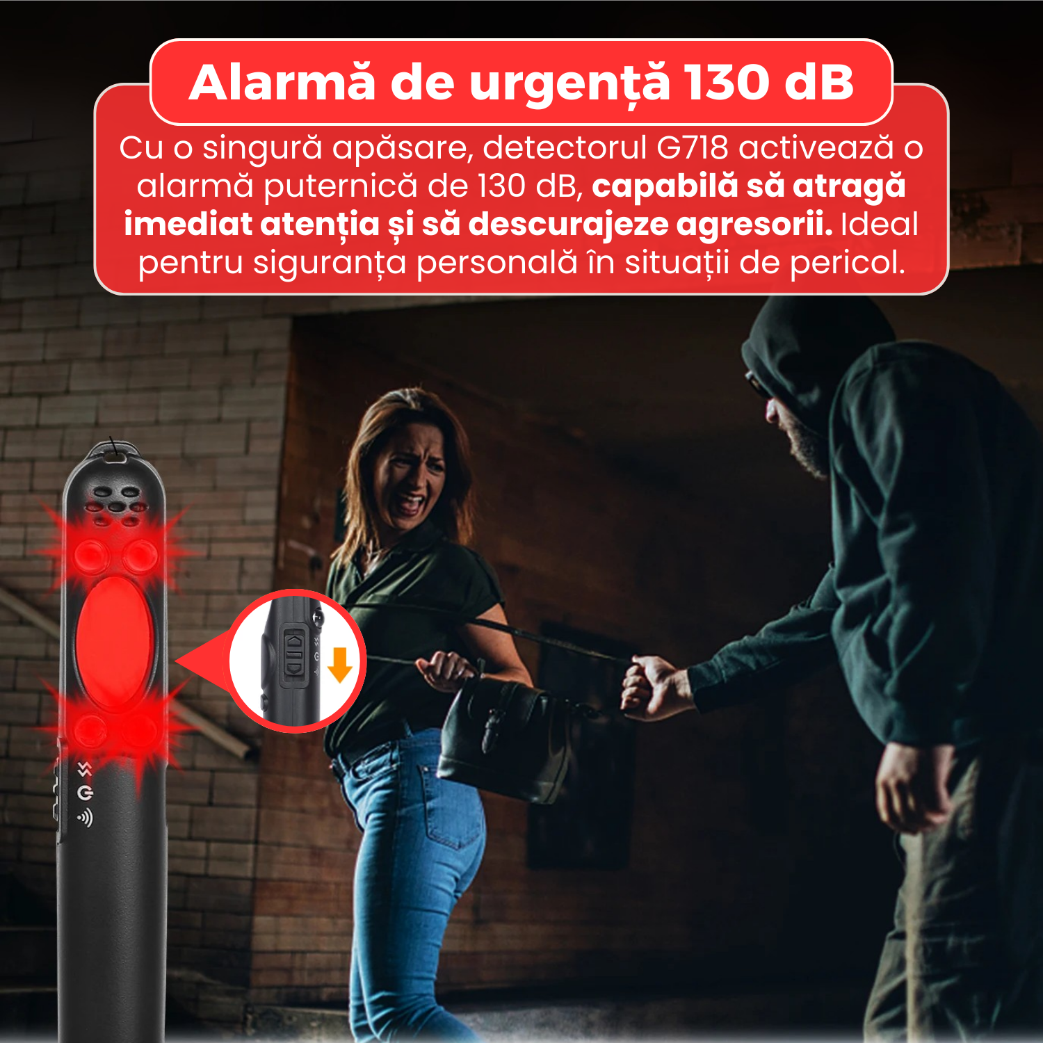 Alarma personala 130 dB – la nevoie, o singura apasare activeaza o sirena extrem de puternica, capabila sa atraga atentia si sa sperie potentialii agresori. Aceasta functie transforma detectorul intr-un instrument de protectie personala de incredere.