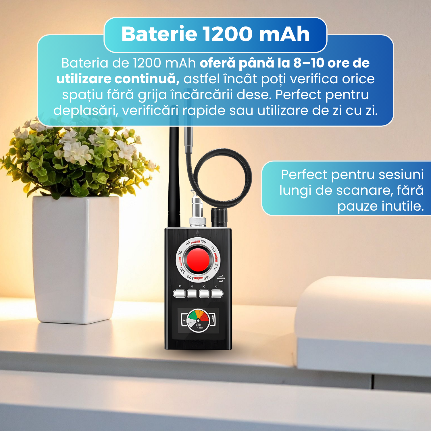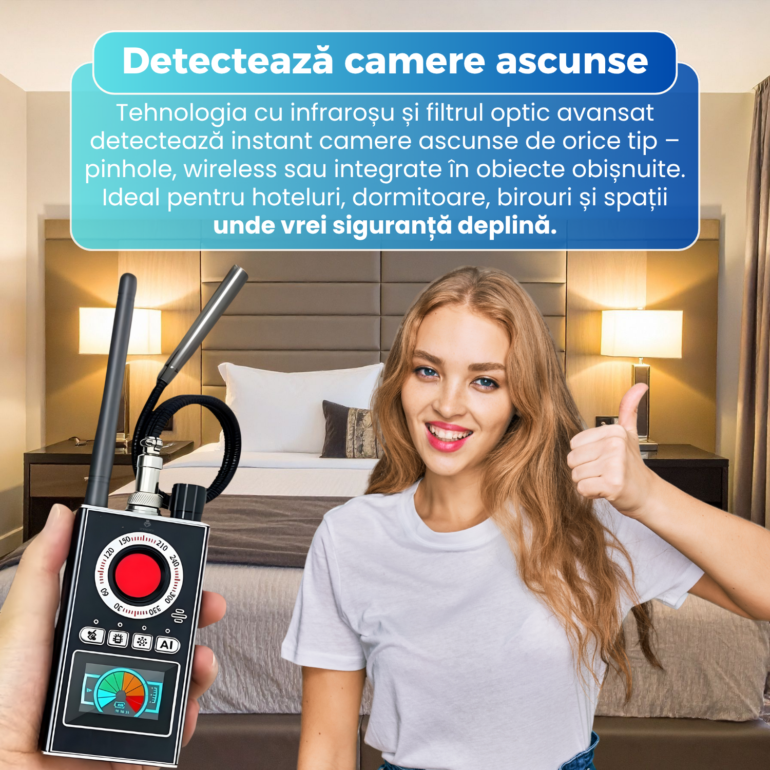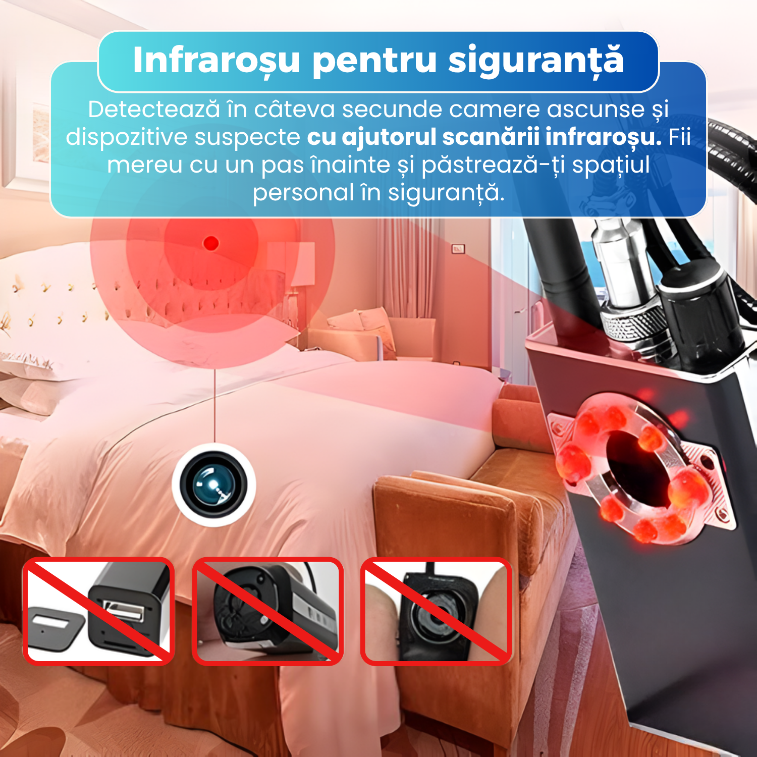 Tehnologia infrarosu integrata combina un filtru optic special conceput pentru a localiza instant camerele ascunse tip pinhole, inclusiv cele integrate discret in obiecte banale precum incarcatoare, ceasuri, detectoare de fum sau decoratiuni. Lumina infrarosie dezvaluie reflexiile specifice lentilelor, ceea ce face ca detectarea sa fie mult mai precisa decat la dispozitivele obisnuite.