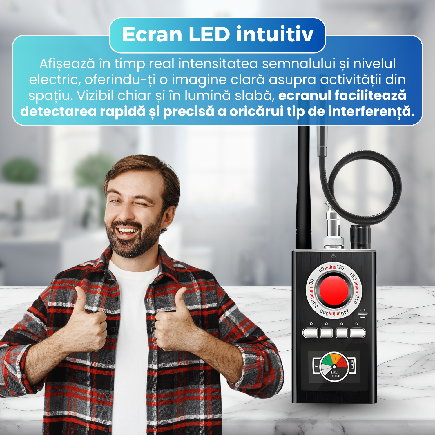 Ecranul LED afiseaza in timp real intensitatea semnalelor detectate, precum si nivelul electric, permitand utilizatorului sa aproximeze rapid distanta si directia din care provine semnalul suspect. Vizibilitatea ridicata il face ideal atat pentru utilizare pe timp de zi, cat si in medii mai intunecate, facilitatand o detectie precisa si eficienta.