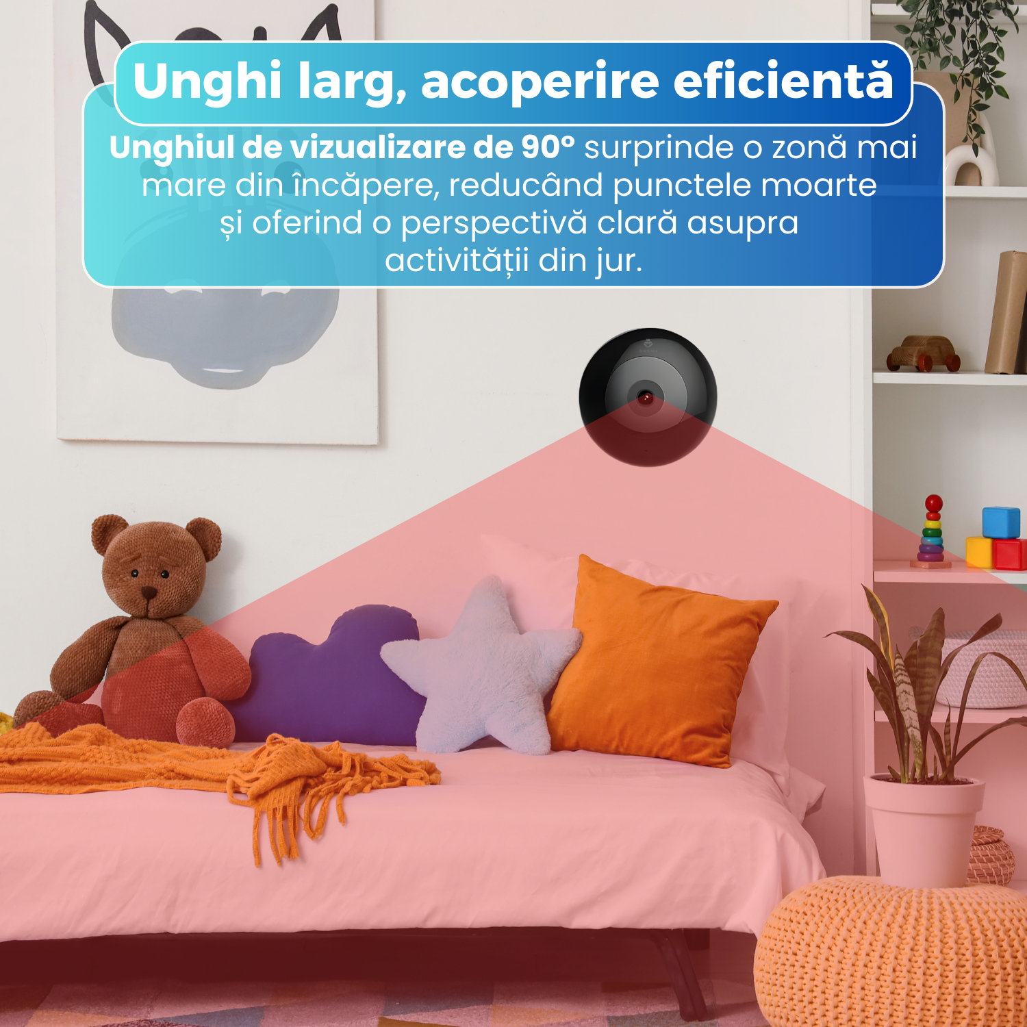Unghiul larg de 90° permite acoperirea eficienta a unei zone extinse din incapere, reducand punctele moarte si oferind o imagine clara asupra intregului spatiu.