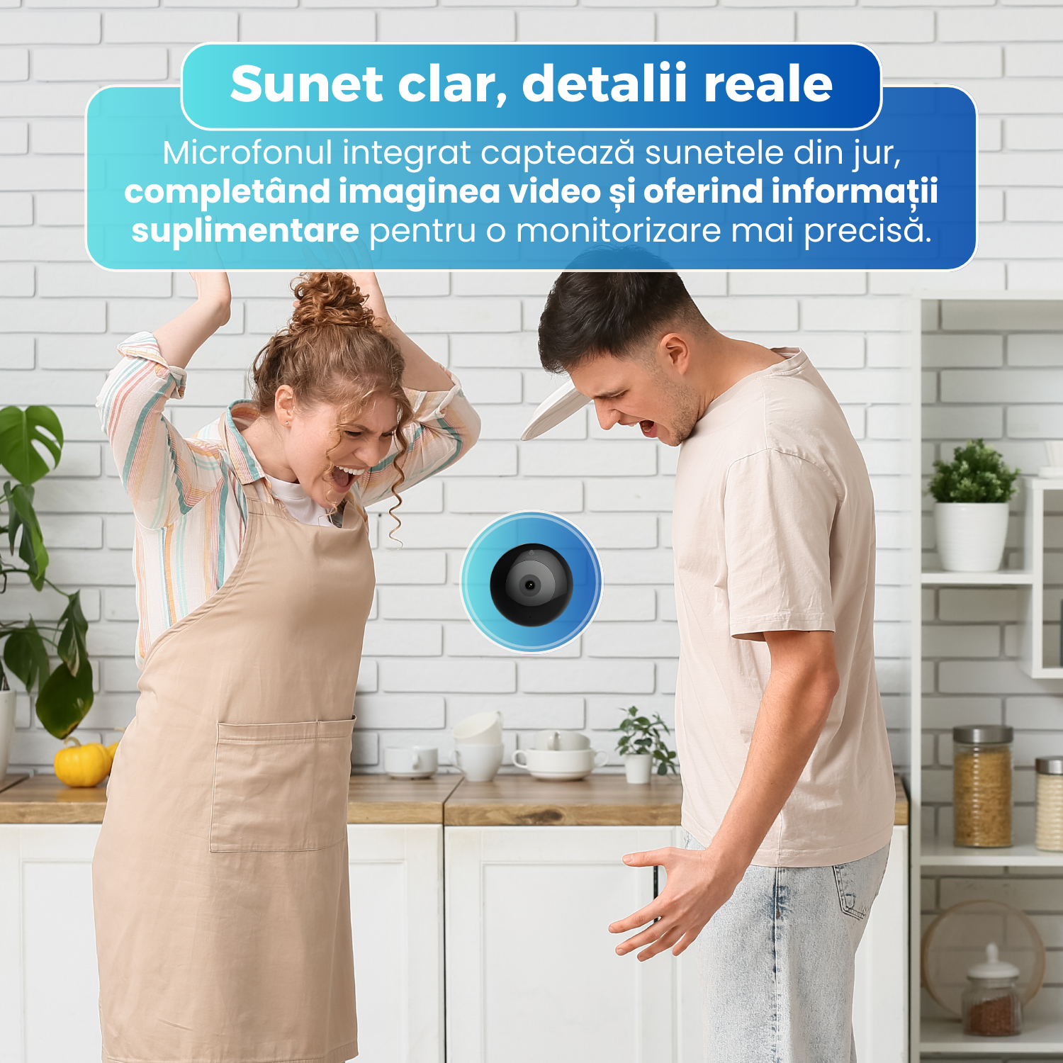 Cu un format miniatural si o greutate de doar 19 g, camera poate fi amplasata discret pe diverse suprafete, fara a fi observata. Dimensiunile reduse o fac ideala pentru utilizare in spatii unde discretia este esentiala.