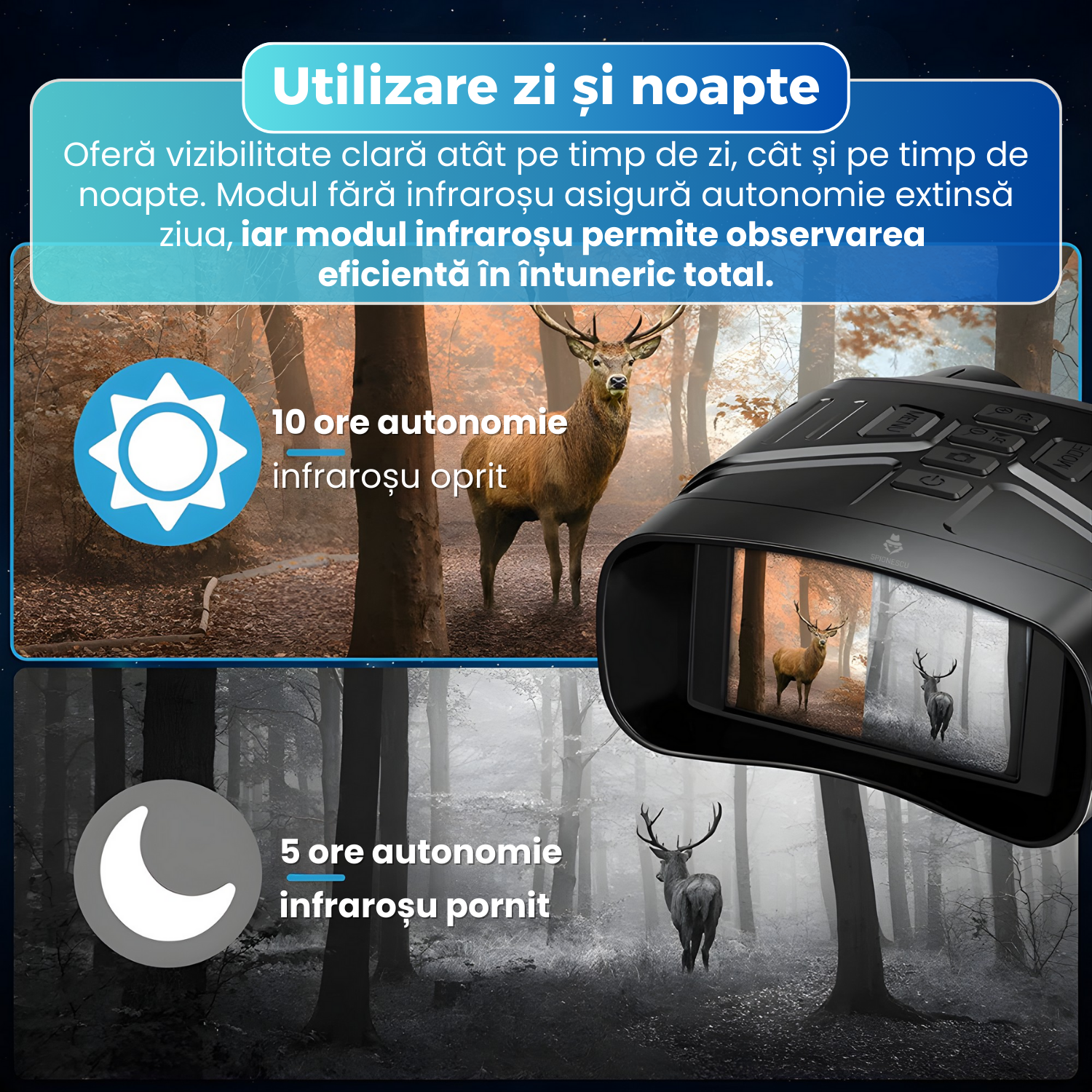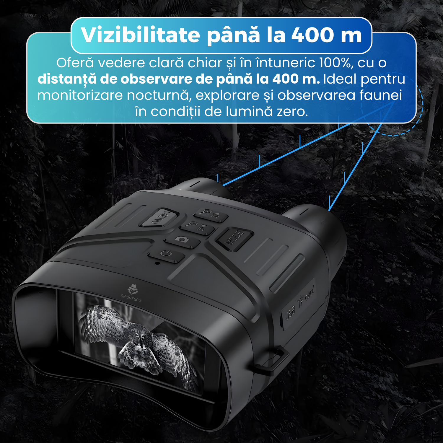 Binoclul este echipat cu tehnologie IR performanta, cu 7 niveluri de infrarosu ajustabile, permitand observarea clara a obiectelor si animalelor chiar si in intuneric complet. Distanta de vizualizare pe timp de noapte poate ajunge pana la 400 m, oferind siguranta si control in orice situatie.