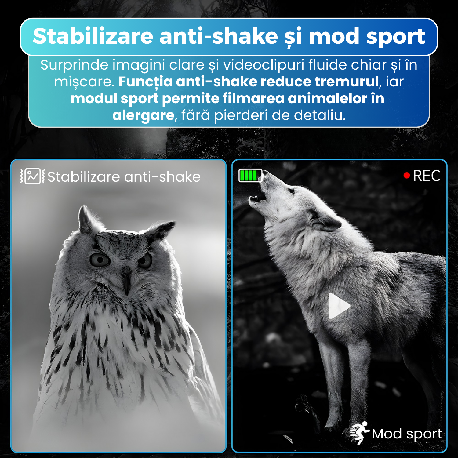 Binoclul este dotat cu functie anti-shake, care reduce tremurul mainii pentru imagini stabile. Modul sport este special conceput pentru filmarea animalelor in miscare sau a scenelor dinamice, mentinand claritatea chiar si in actiune.