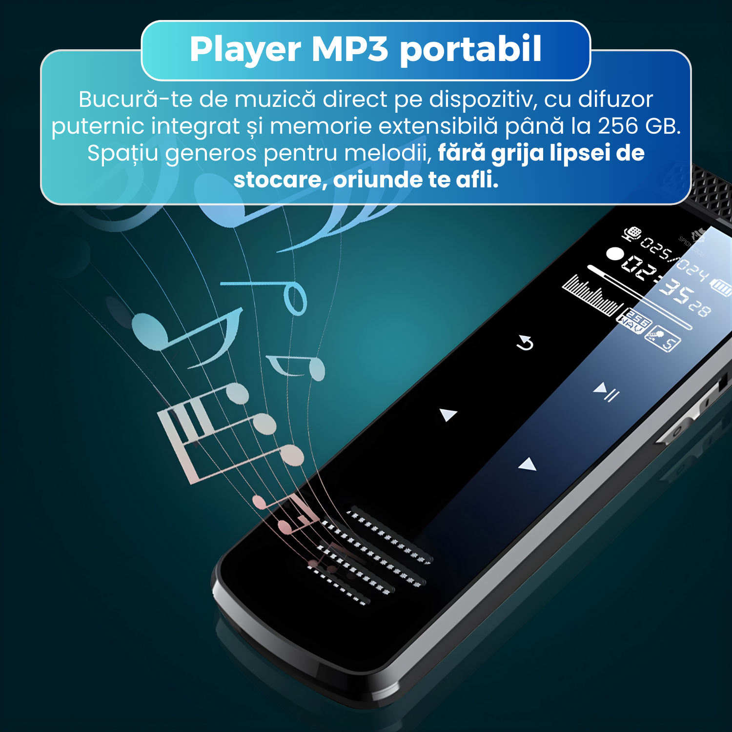 Dispozitivul functioneaza si ca player MP3, permitand redarea muzicii sau a inregistrarilor direct pe difuzorul incorporat. Memoria poate fi extinsa pana la 256 GB, oferind spatiu generos pentru fisiere audio si muzica.