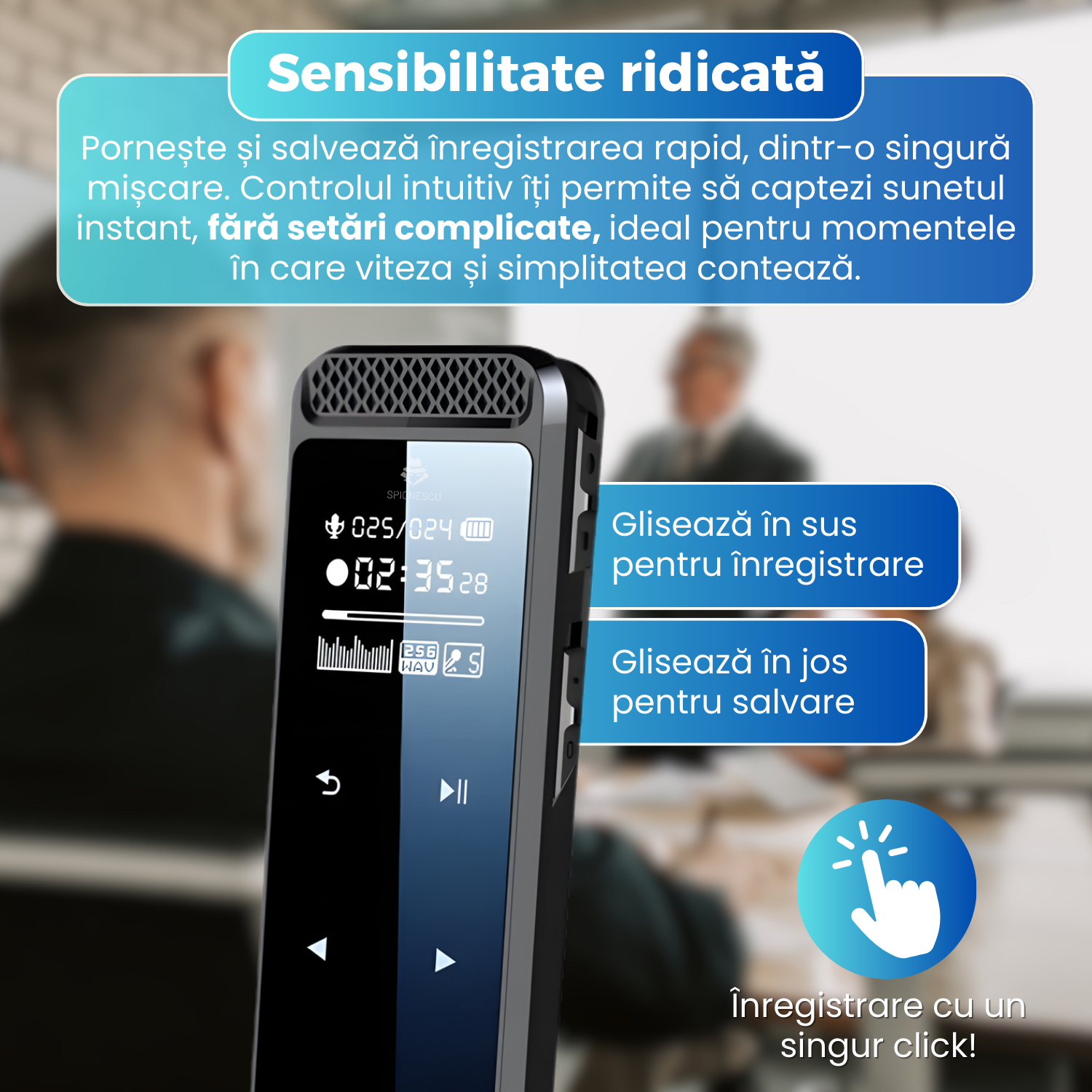 Pornirea si salvarea inregistrarii se fac rapid, printr-o singura miscare. Interfata intuitiva elimina necesitatea navigarii prin meniuri complexe, permitand utilizarea instantanee in situatii in care viteza este esentiala.