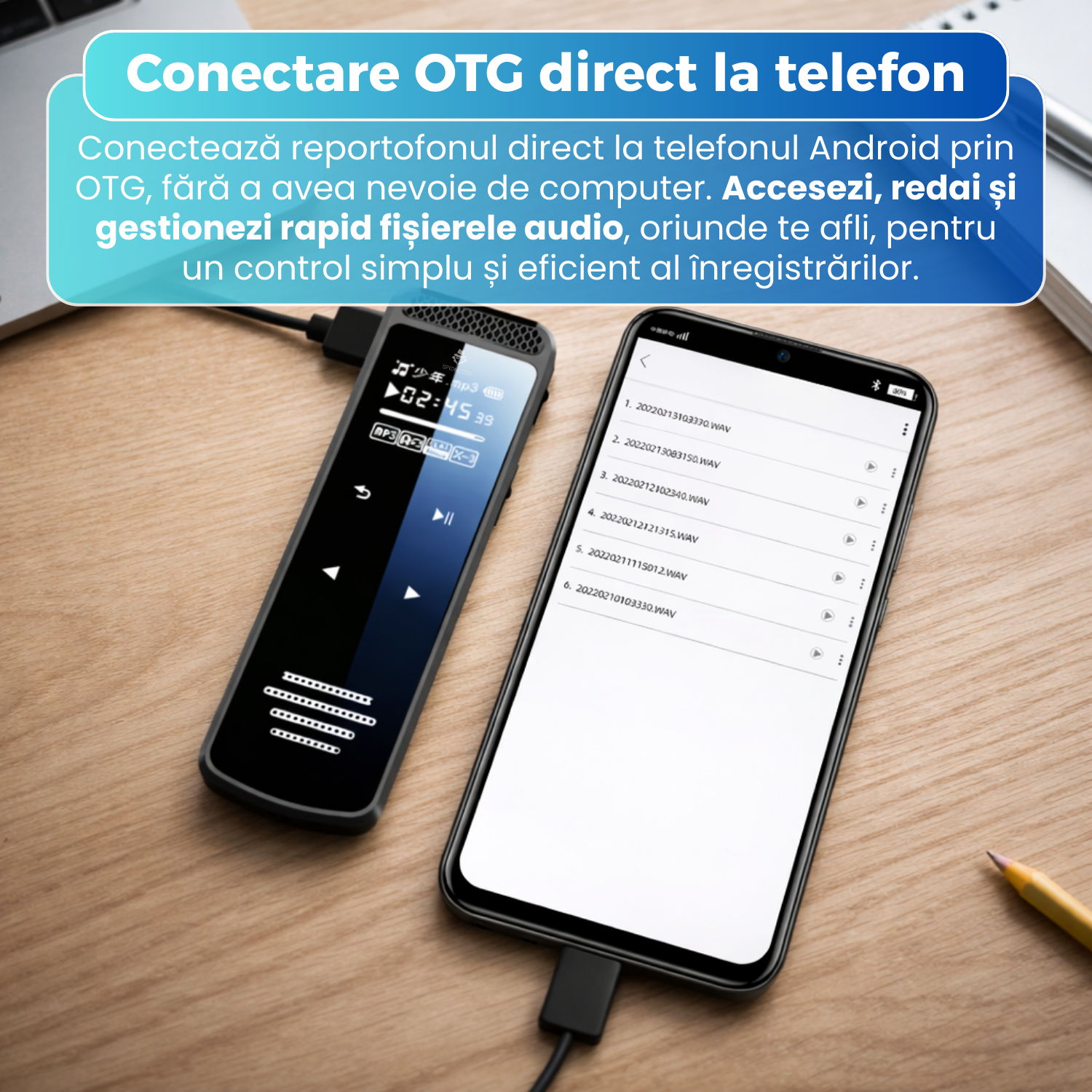 Reportofonul se poate conecta direct la telefonul Android prin OTG, fara a fi necesar un computer. Poti copia, sterge sau reda fisierele audio direct de pe telefon, oferind flexibilitate maxima atunci cand esti in miscare.