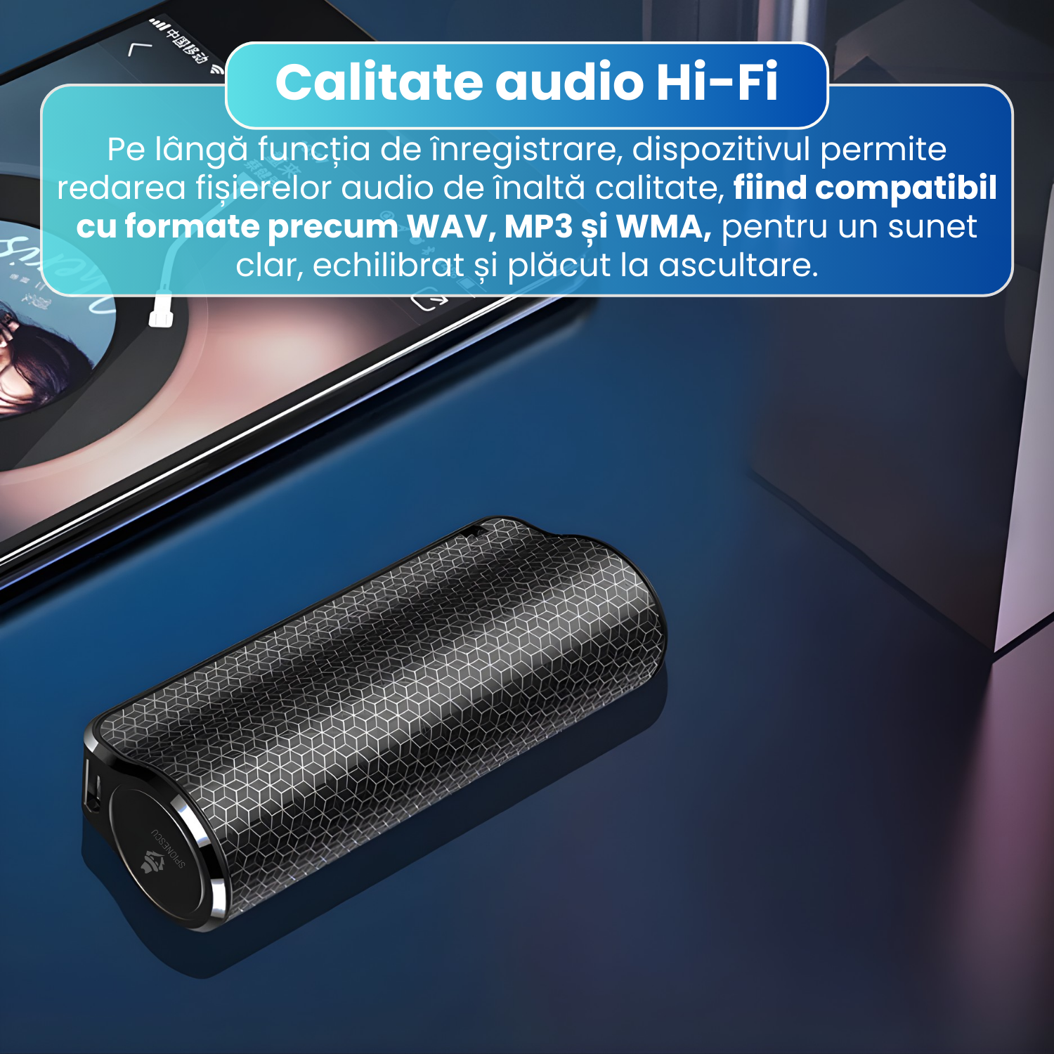 Pe langa inregistrare, dispozitivul functioneaza si ca player audio, fiind compatibil cu formate precum WAV, MP3 si WMA. Acest lucru permite ascultarea rapida a fisierelor direct de pe dispozitiv.