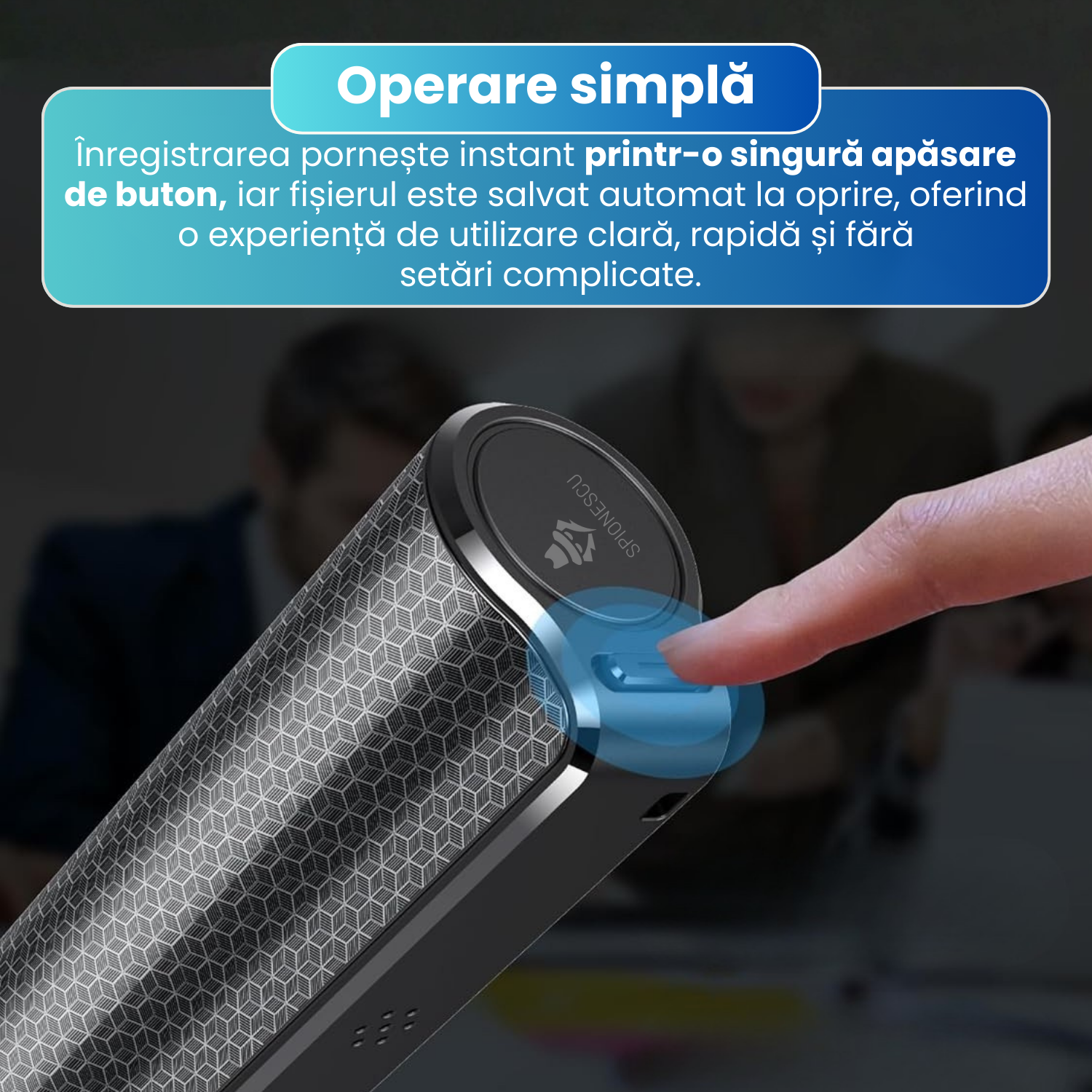 Microfonul performant capteaza sunetul clar din toate directiile, oferind inregistrare 360°. Raza eficienta de captare este de pana la 60 m in conditii reale de utilizare, iar in conditii ideale poate ajunge pana la 100 m, asigurand redarea fidela a conversatiilor.