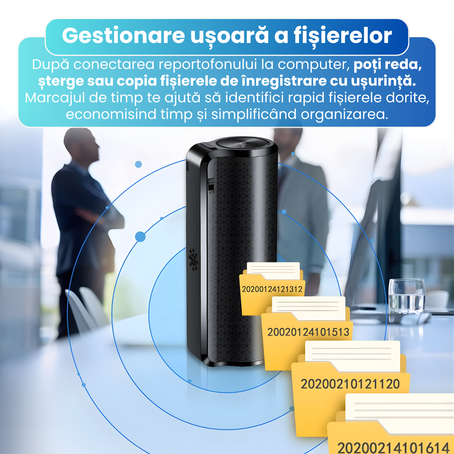 Prin conectarea la computer, fisierele pot fi redate, copiate sau sterse rapid. Fisierele sunt salvate cu marcaj de timp, facilitand identificarea si organizarea inregistrarilor.