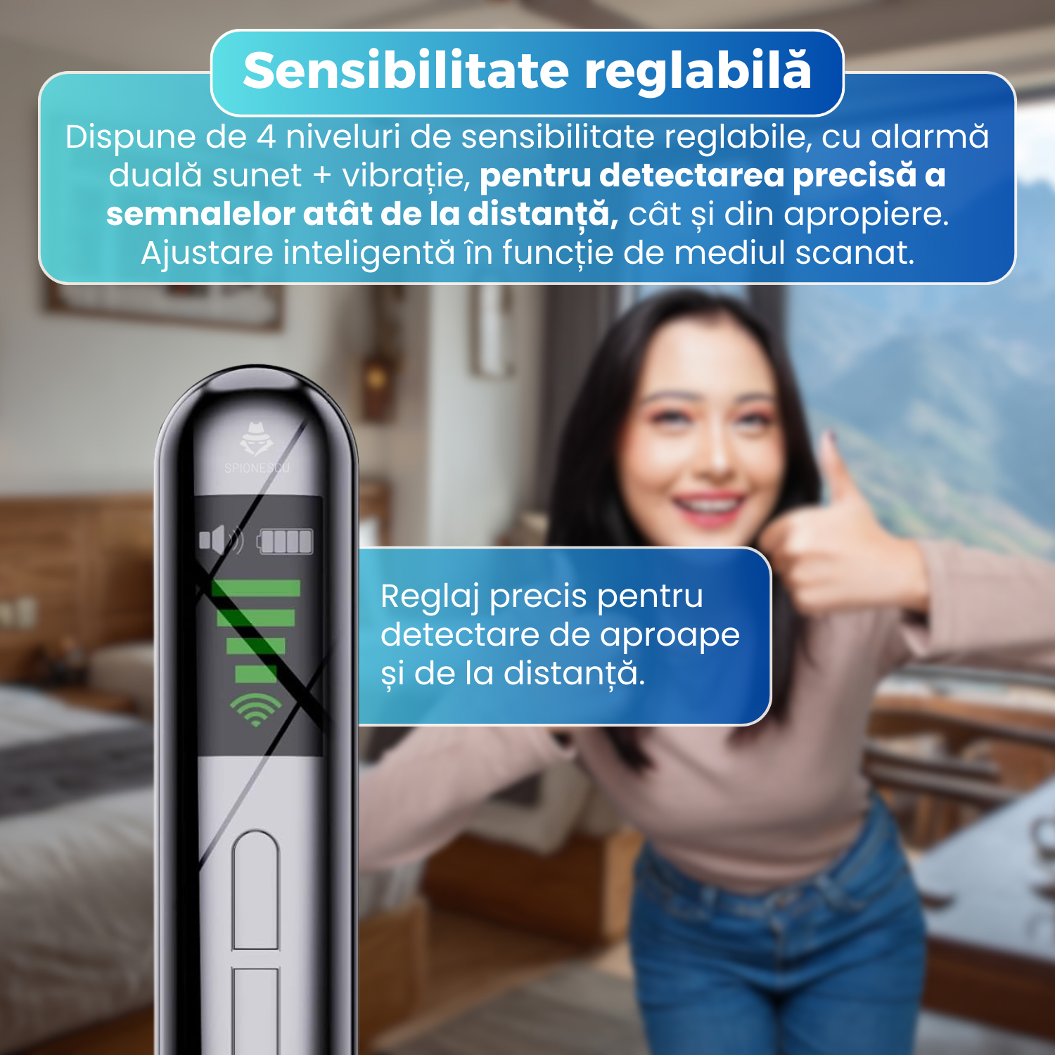Detectorul scaneaza frecventele radio utilizate de microfoanele ascunse, oferind protectie impotriva interceptarilor audio neautorizate. Aceasta functie este esentiala pentru protejarea conversatiilor private, intalnirilor de afaceri sau informatiilor confidentiale.