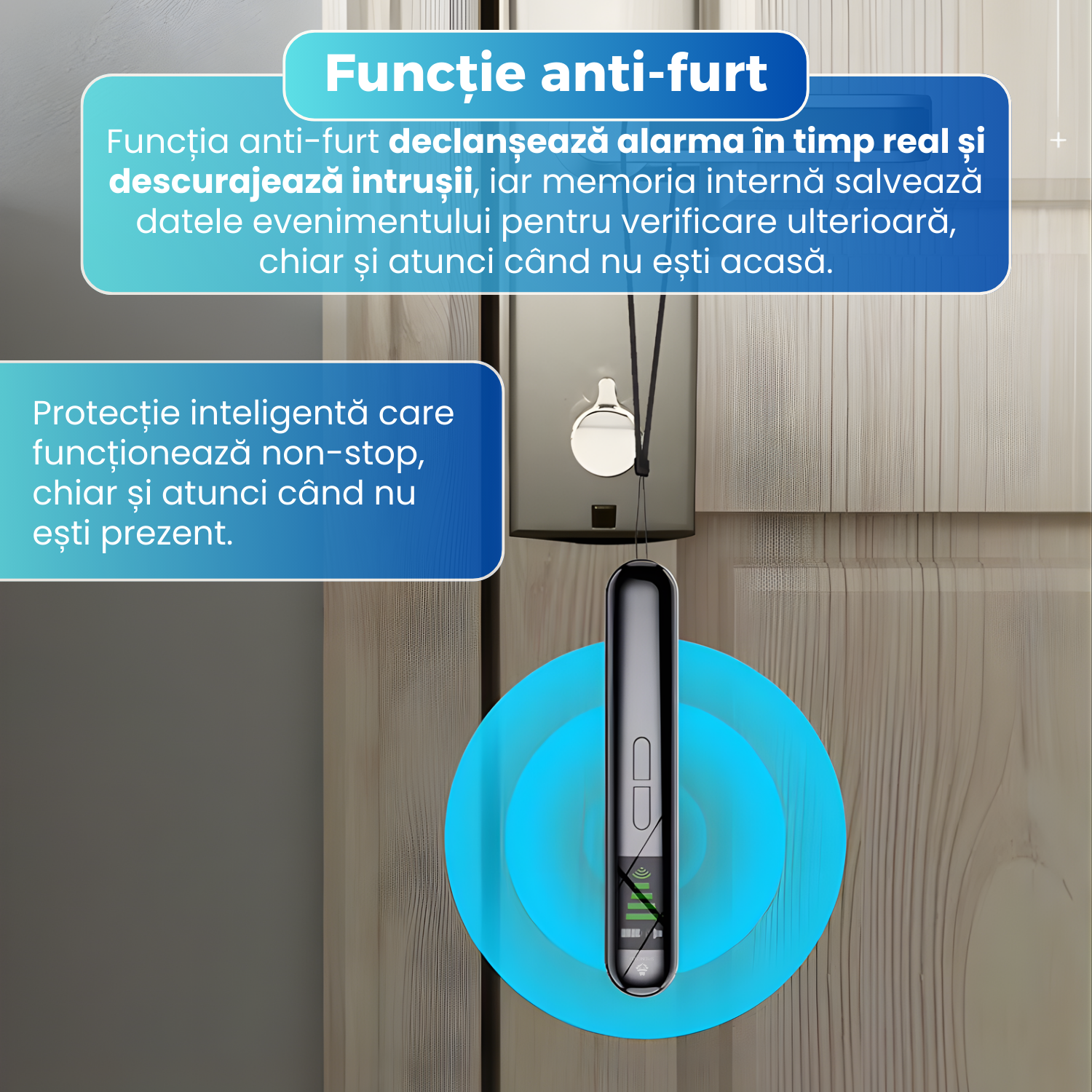 Detectorul dispune de functie anti-furt care declanseaza alarma in cazul unei miscari sau tentative neautorizate. Memoria integrata permite stocarea evenimentelor, oferind posibilitatea de verificare ulterioara.
