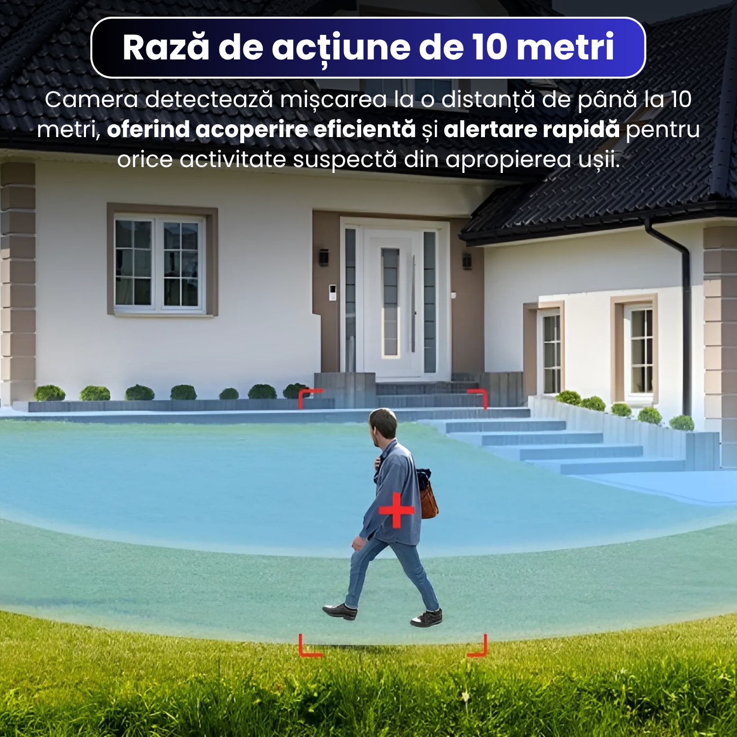 Detectare inteligenta a miscarii – notificari in timp real Senzorul performant detecteaza miscari in raza de 10 metri si trimite instant notificari catre telefonul tau. Astfel, esti mereu la curent cu activitatea din fata usii si poti lua masuri rapide daca este necesar.