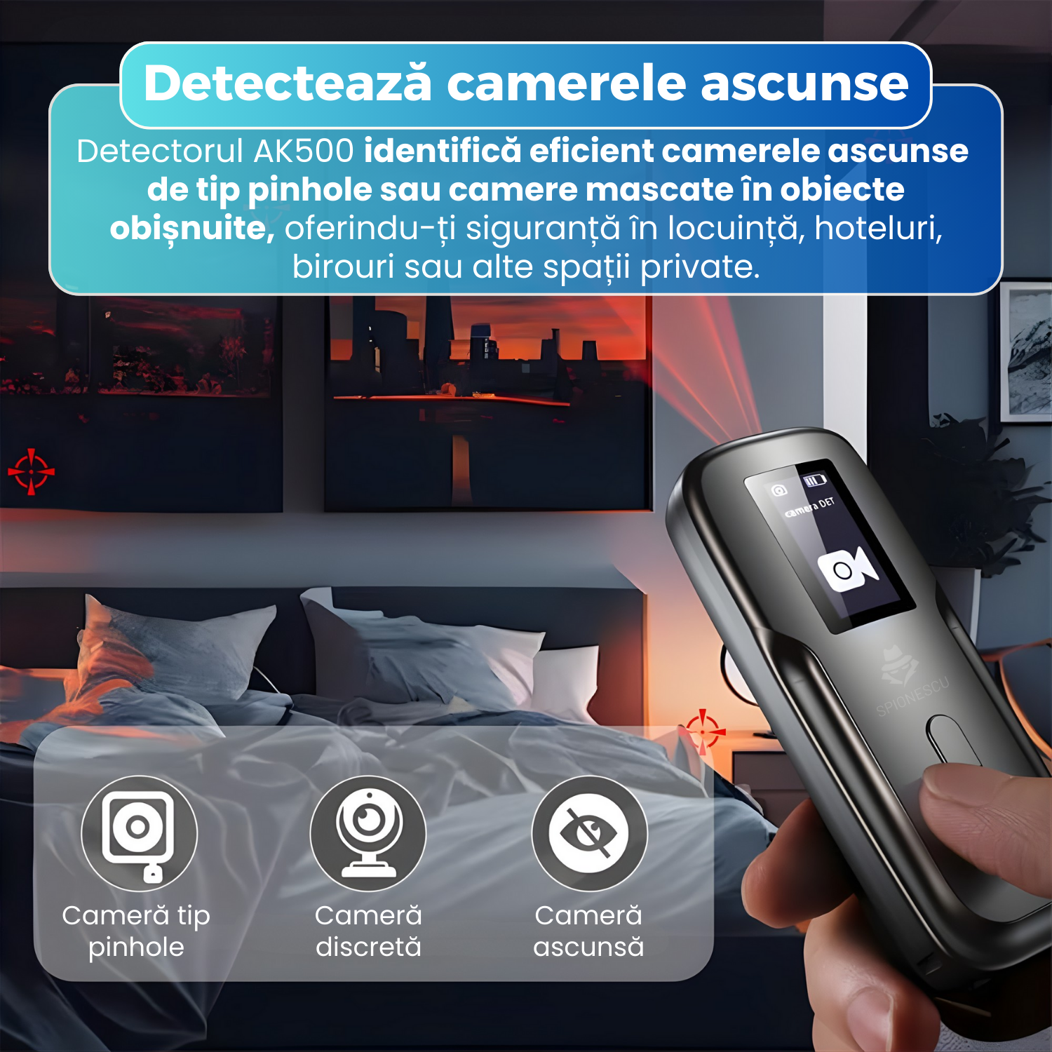 Detectorul AK500 este conceput pentru a identifica eficient camere ascunse de tip pinhole sau camere mascate in obiecte obisnuite, precum prize, ceasuri, detectoare de fum sau alte accesorii aparent inofensive. Functia de detectare vizuala combinata cu analiza semnalelor permite localizarea rapida a dispozitivelor de supraveghere video, inclusiv in spatii slab iluminate sau greu accesibile, oferindu-ti un nivel ridicat de protectie a intimitatii.