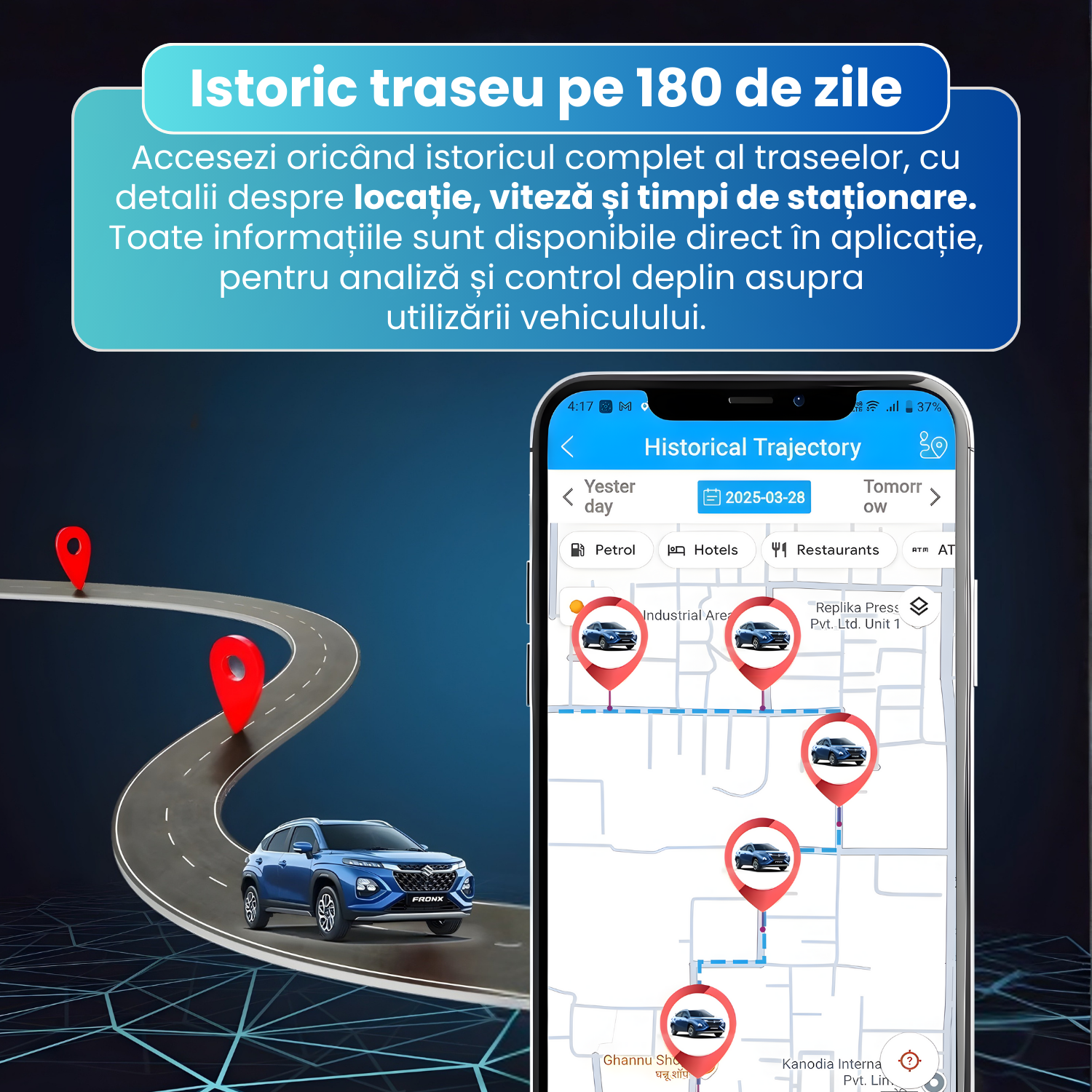 Dispozitivul inregistreaza traseele parcurse pe o perioada extinsa, oferind acces la istoricul complet al deplasarilor. Poti analiza rutele utilizate, viteza de deplasare, locatiile exacte si timpii de stationare, informatii esentiale pentru monitorizare, organizare si optimizarea utilizarii vehiculului sau a flotei.