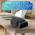 Cand este conectat la portul OBD, dispozitivul functioneaza non-stop, asigurand monitorizare continua fara intreruperi. Bateria interna de 180 mAh ofera pana la 6 ore de functionare independenta si pana la 30 de zile in modul standby, fiind utila in situatii neprevazute sau atunci cand vehiculul nu este utilizat frecvent.