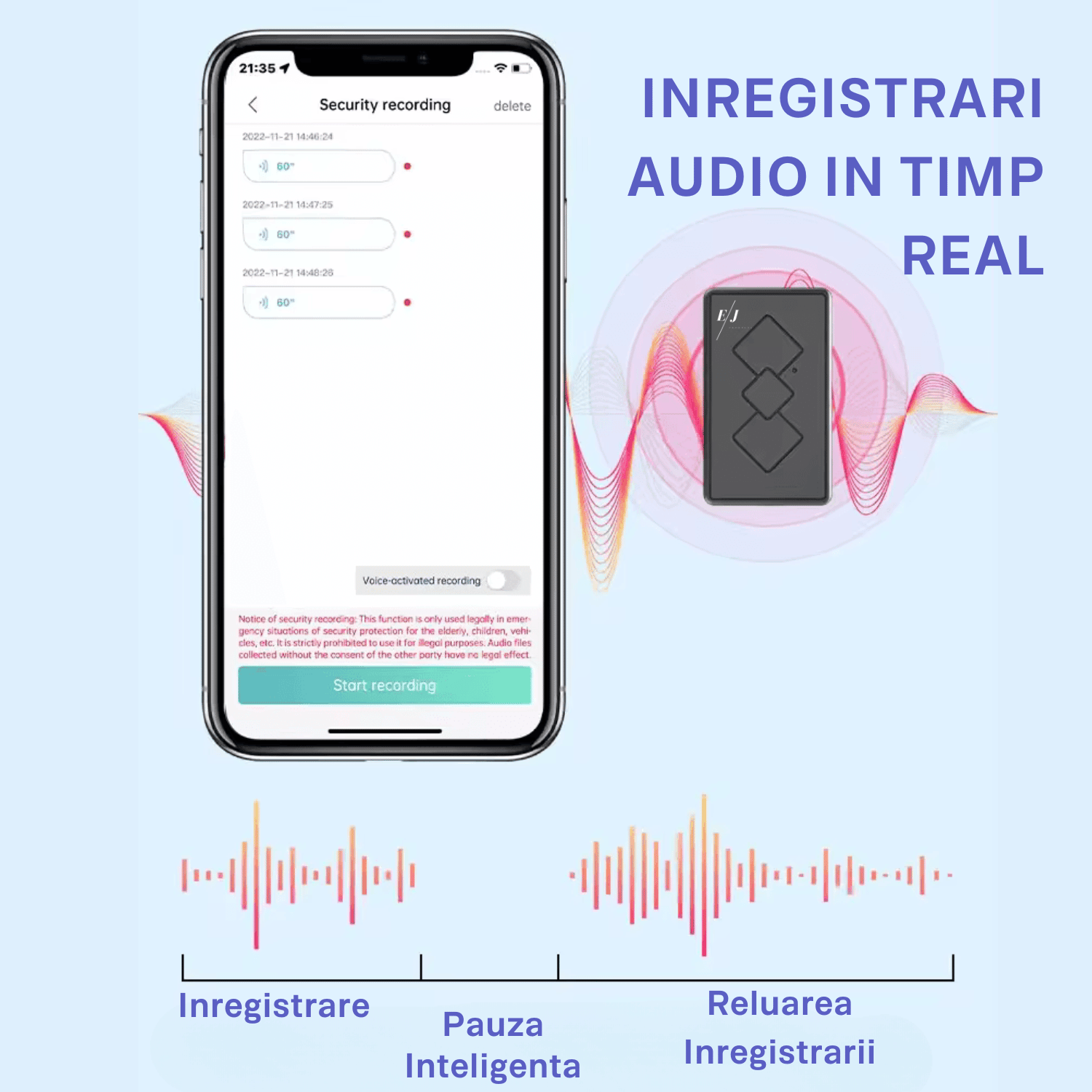 Istoric Traseu: Platforma noastra cloud salveaza datele de conducere, permitandu-ti sa verifici inregistrarile anterioare oricand doresti. Mai mult, localizatorul inregistreaza automat si incarca pe cloud sunetele din jurul sau cand decibelii depasesc 30dB, oferindu-ti control complet asupra itinerarului vehiculului tau.