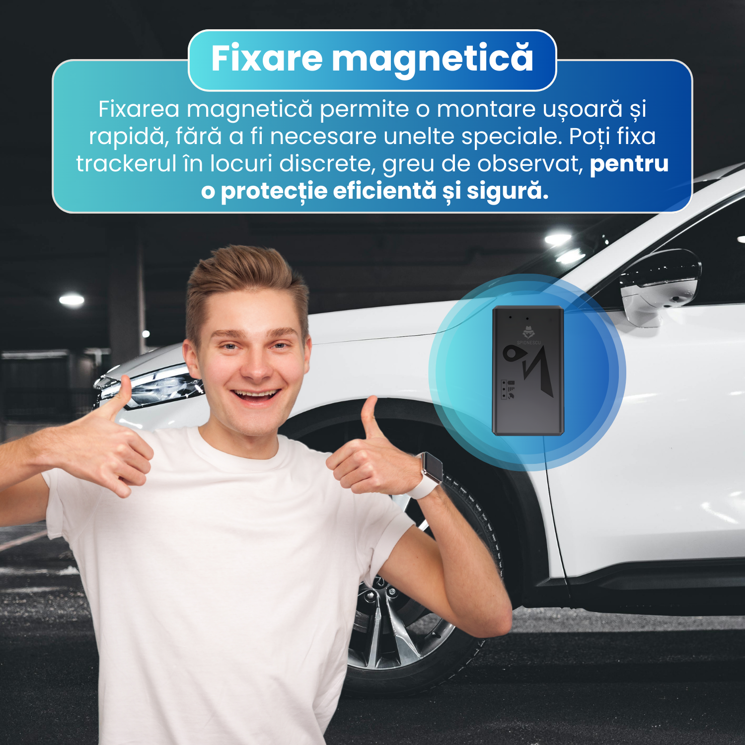Fixarea magnetica permite o montare usoara si rapida, fara a fi necesare unelte speciale sau cabluri. Trackerul poate fi amplasat in locuri discrete, greu de observat, pentru o utilizare sigura si eficienta, fara a afecta aspectul sau functionarea vehiculului.