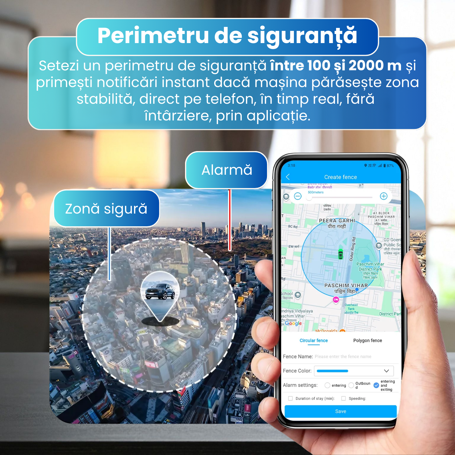 Dispozitivul permite setarea unui perimetru de siguranta intre 100 si 2000 m in jurul vehiculului. In momentul in care masina paraseste zona stabilita, primesti notificari instant direct pe telefon, in timp real. Aceasta functie este ideala pentru prevenirea furturilor, monitorizarea copiilor sau controlul utilizarii vehiculului in scop personal sau profesional.