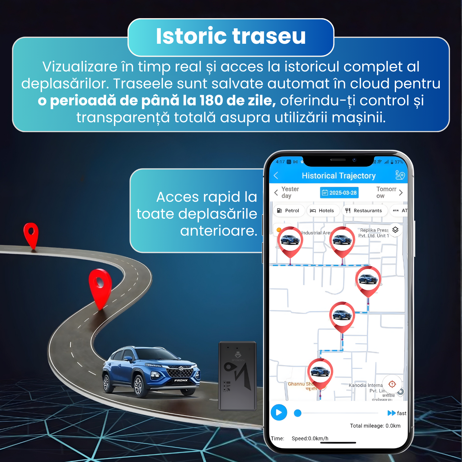 Toate deplasarile sunt inregistrate si salvate automat in cloud pentru o perioada de pana la 180 de zile. Ai acces rapid la istoricul complet al traseelor parcurse, ceea ce iti permite sa analizezi rutele, frecventa deplasarilor si distantele parcurse, fara a pierde informatii importante.