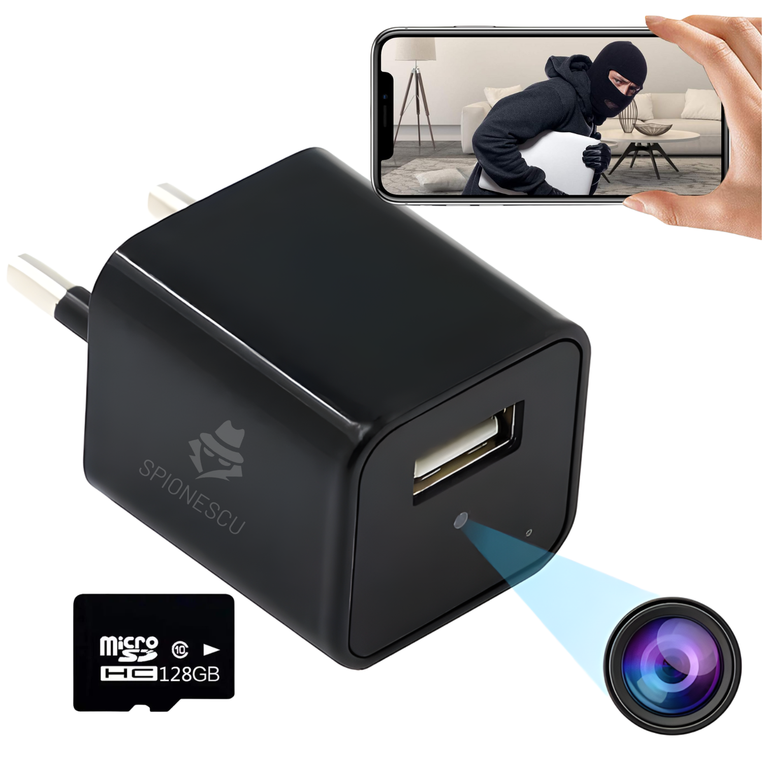 Dispozitivul arata identic cu un incarcator USB obisnuit si poate fi folosit in acelasi timp pentru a incarca telefonul sau alte gadgeturi. Lentila este perfect integrata in carcasa, iar lipsa oricarui indicator luminos asigura utilizarea complet discreta, fara a trezi suspiciuni.