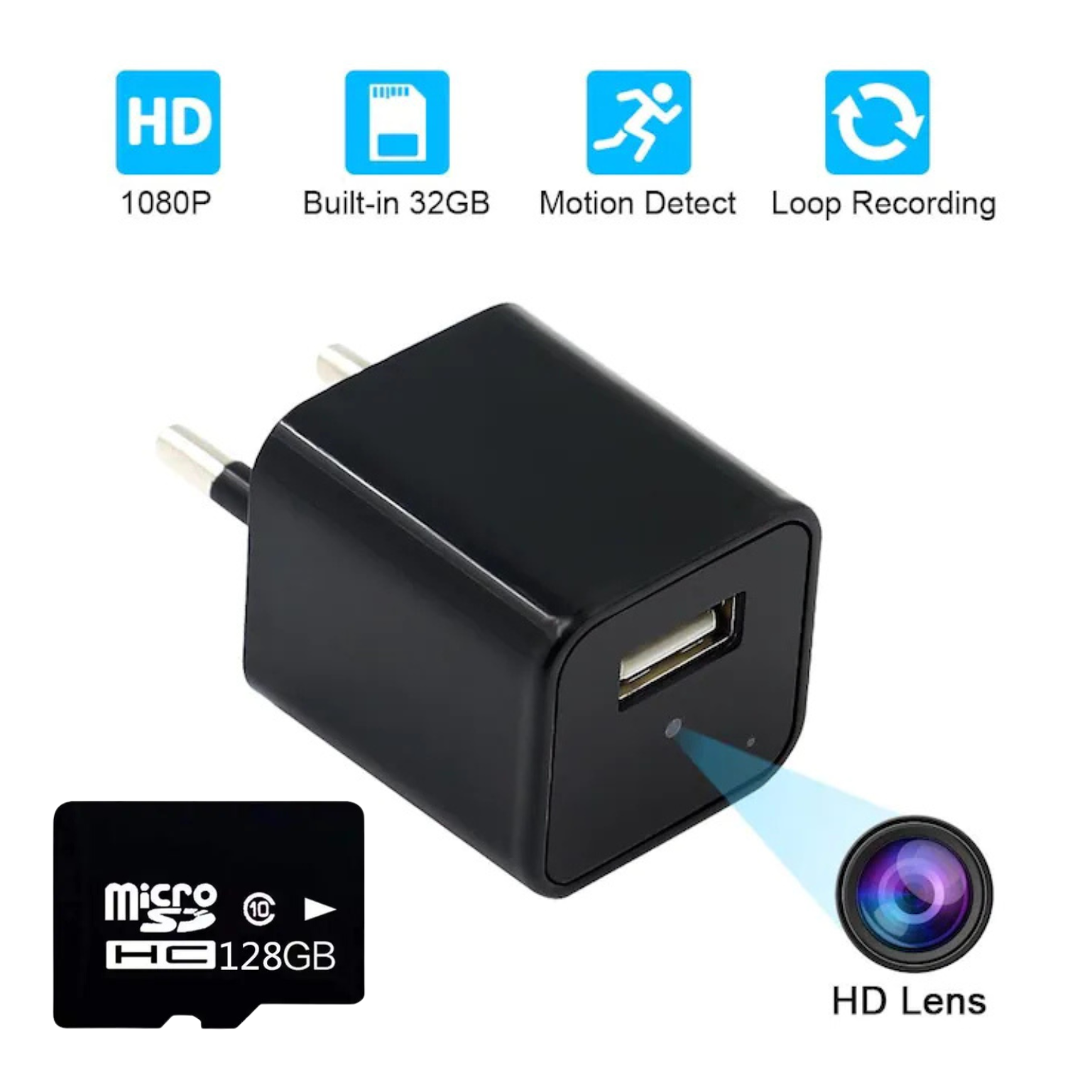 Incarcator USB cu camera ascunsa, WiFi, Full HD, aplicatie dedicata
