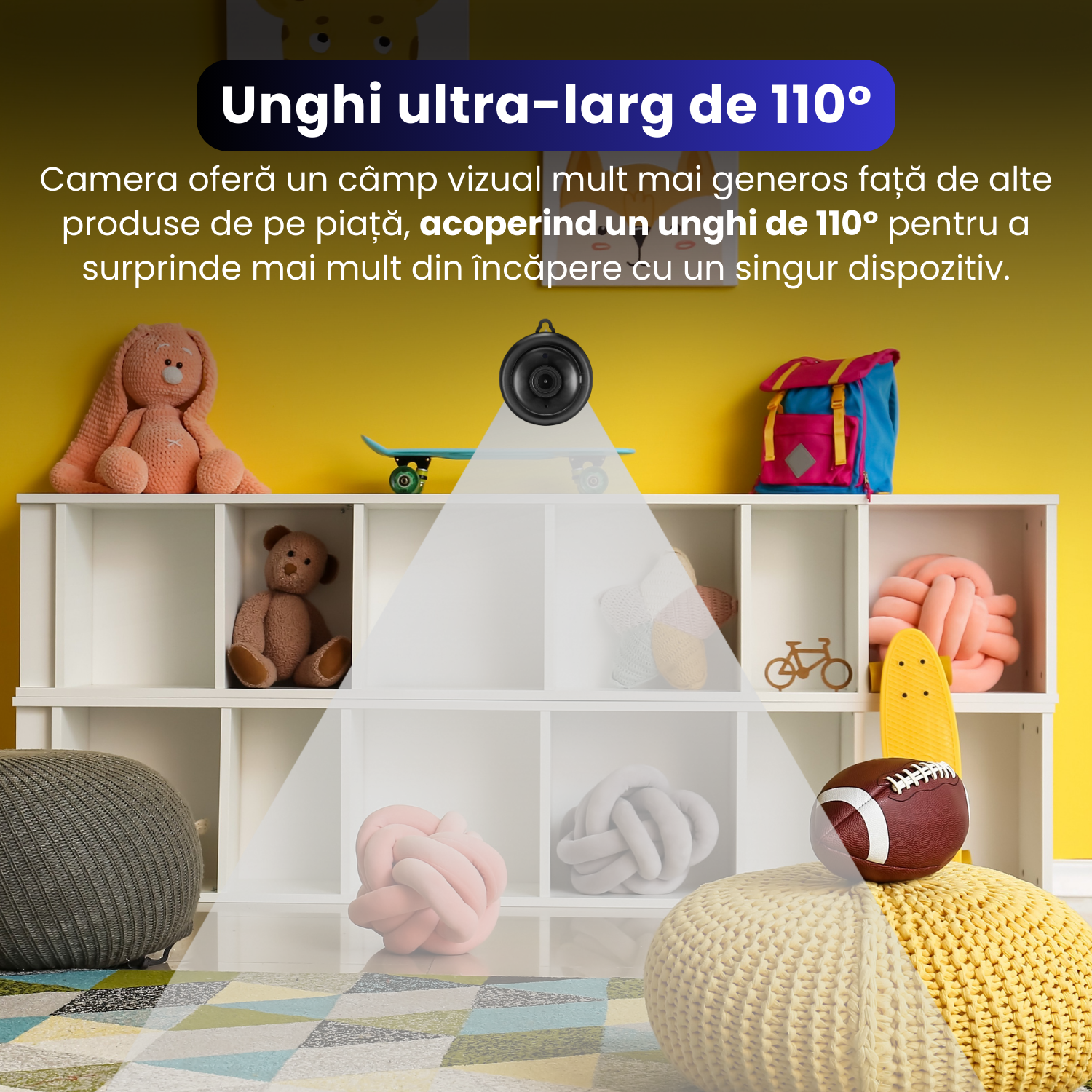 Camera este echipata cu un unghi ultra-larg de 110°, oferind un camp vizual mult mai extins fata de camerele conventionale. Acest unghi larg iti permite sa surprinzi o zona mai mare din incapere, astfel incat sa ai o imagine de ansamblu fara a fi nevoie sa instalezi mai multe dispozitive in acelasi spatiu. Fie ca este montata intr-un colt al camerei sau pe perete, camera capteaza cu usurinta tot ce se intampla in jur, reducand semnificativ punctele moarte. Este o solutie ideala pentru livinguri, birouri, holuri sau orice alt spatiu in care vrei o supraveghere completa si eficienta, cu un singur dispozitiv.