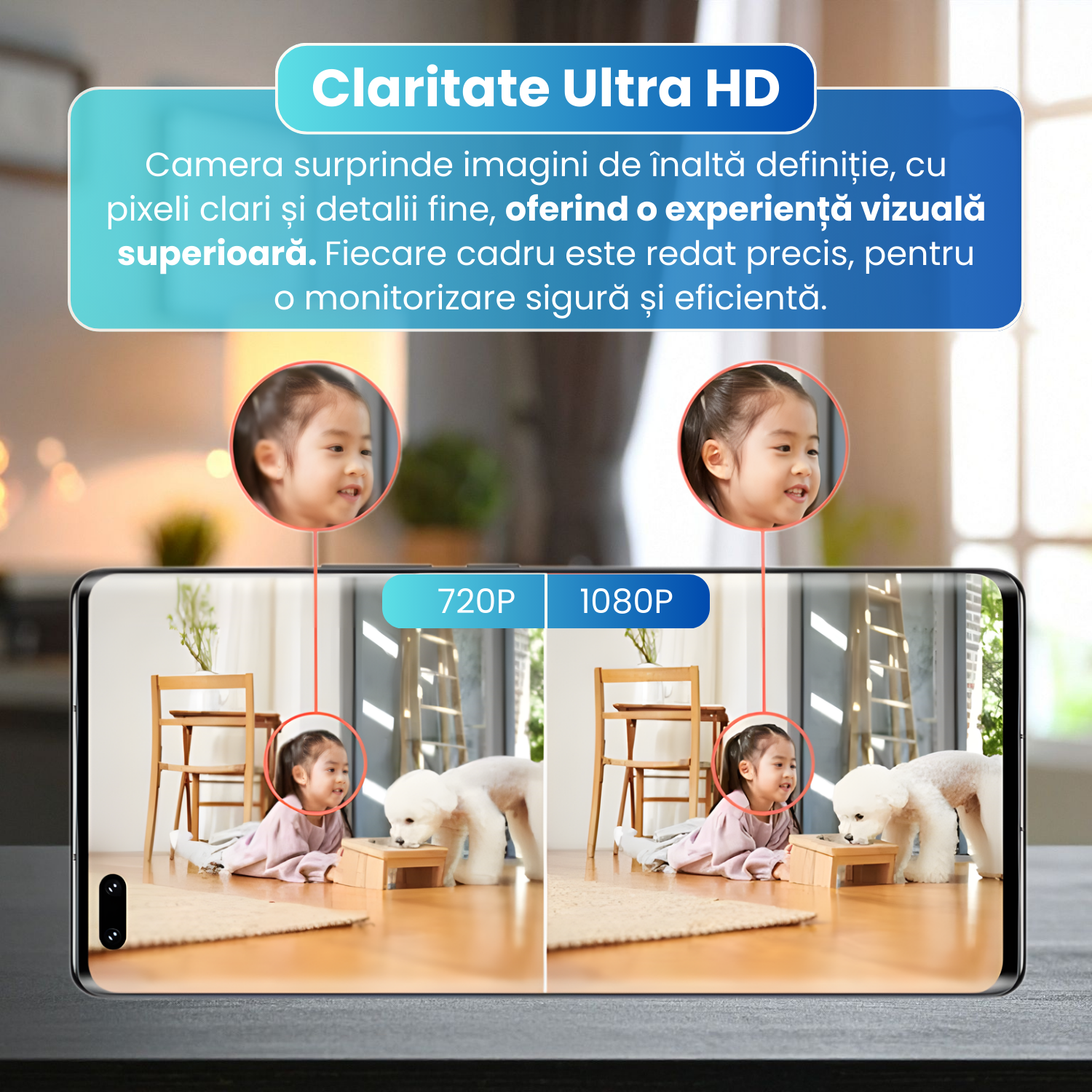 Camera inregistreaza la rezolutie Full HD 1080P, oferind imagini clare si detalii bine definite. Este ideala pentru identificarea persoanelor si obiectelor din cadru, asigurand o monitorizare eficienta in utilizarea zilnica.