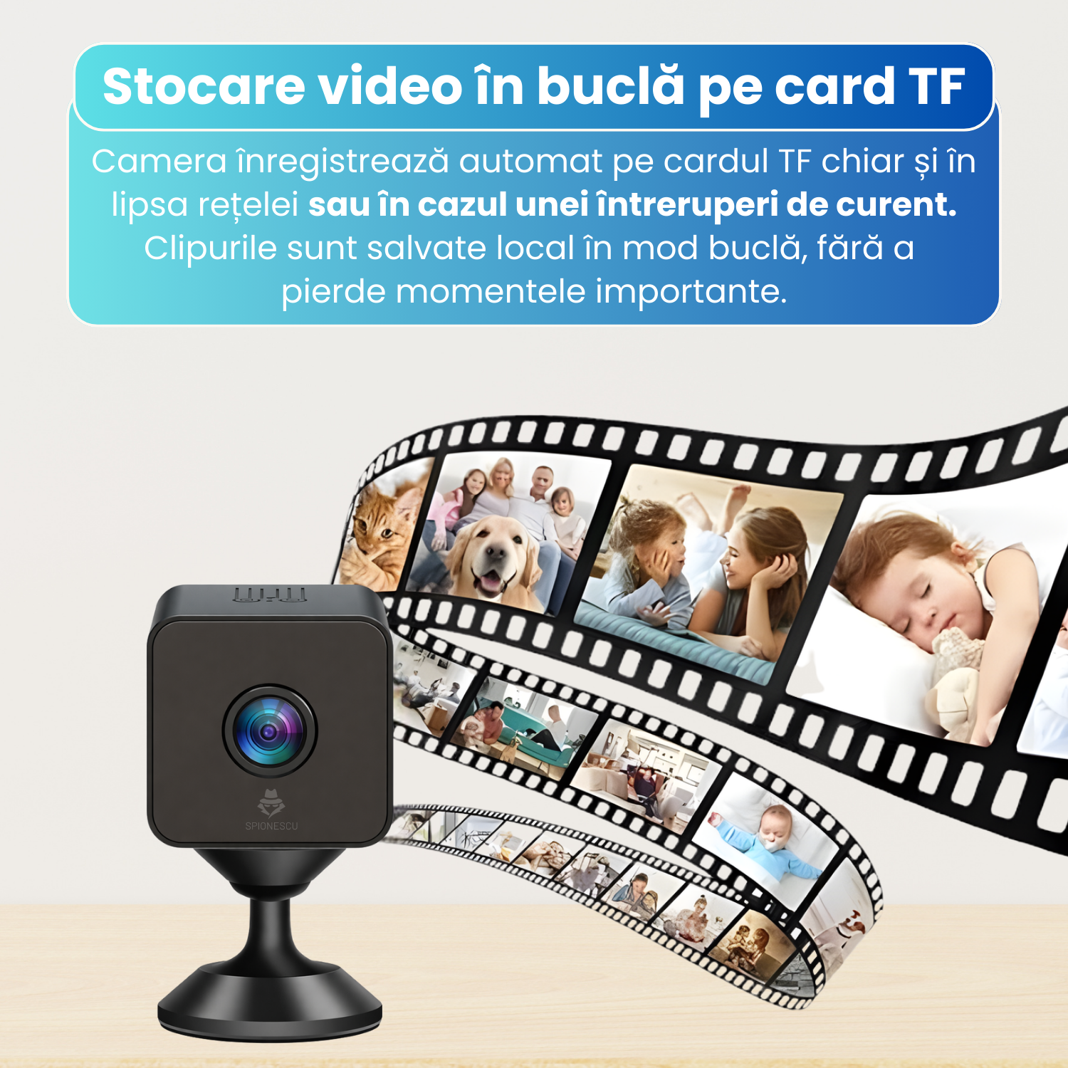 Inregistrarile sunt salvate pe card TF, iar functia de inregistrare in bucla suprascrie automat fisierele vechi atunci cand memoria este plina. Camera poate functiona si fara internet, pastrand datele local.