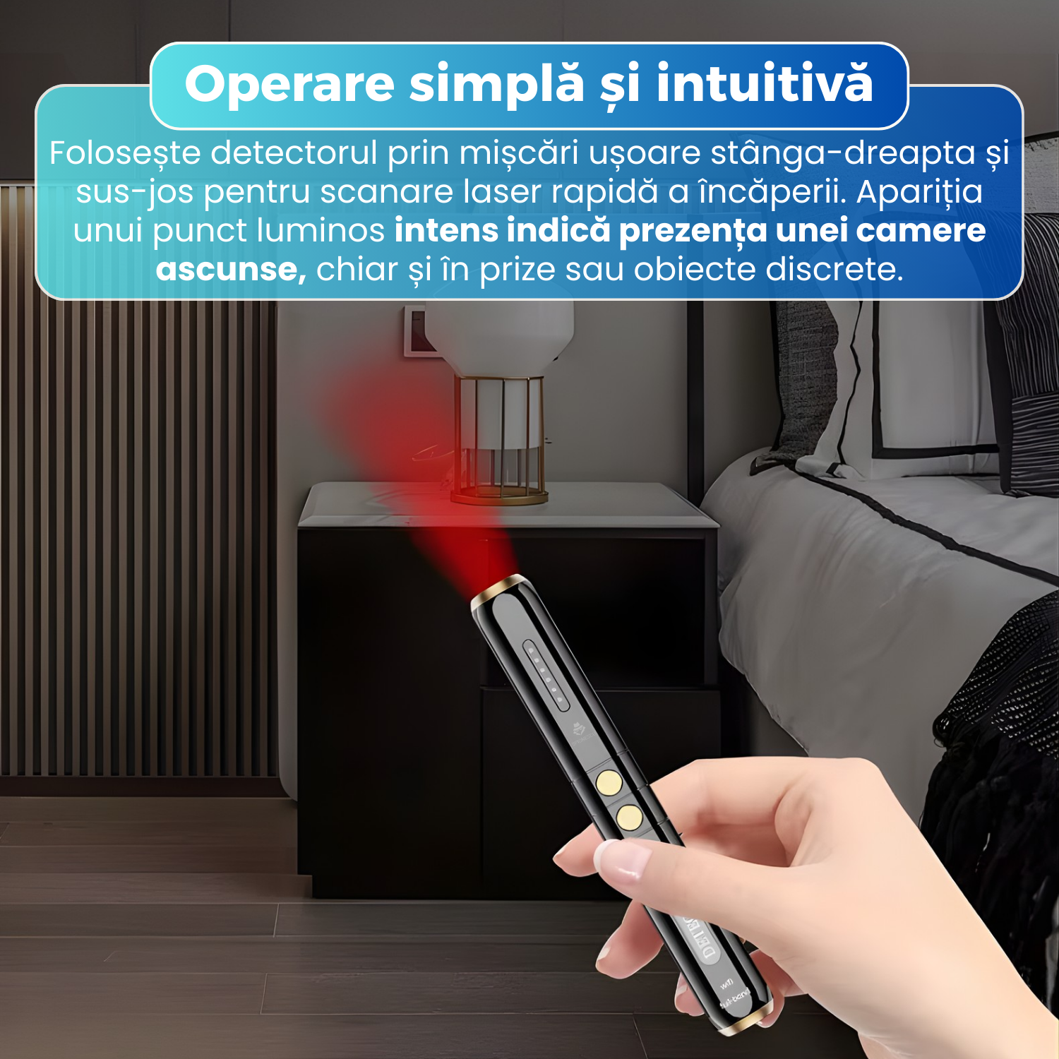 Utilizarea este extrem de usoara: deplasezi detectorul stanga-dreapta si sus-jos pentru a scana incaperea. Aparitia unui punct luminos intens sau cresterea semnalului indica prezenta unui dispozitiv ascuns.