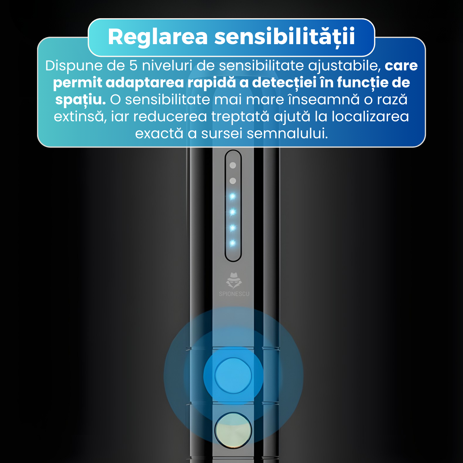 Detectorul dispune de 5 niveluri de sensibilitate ajustabile, care permit extinderea sau restrangerea zonei de detectie. Pe masura ce sensibilitatea este redusa, zona de scanare se ingusteaza, facilitand localizarea exacta a dispozitivului spion.