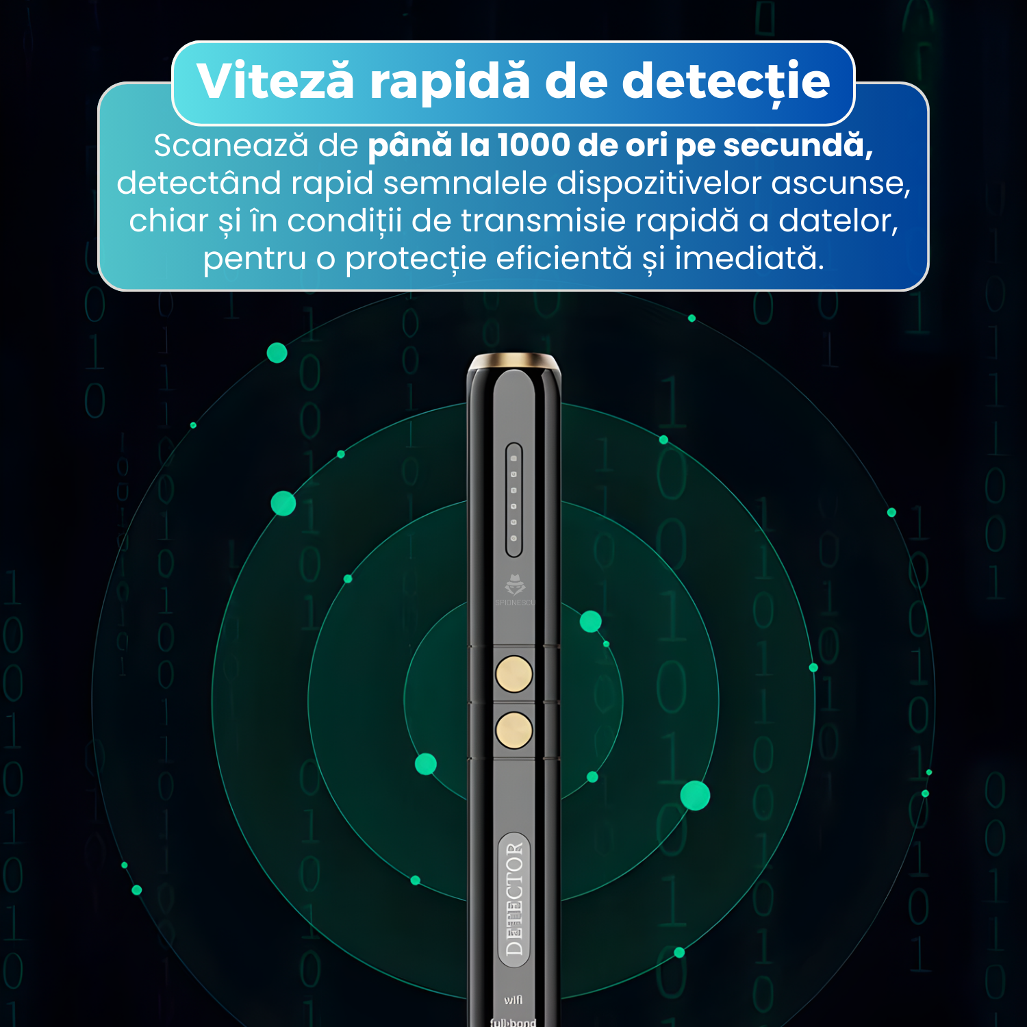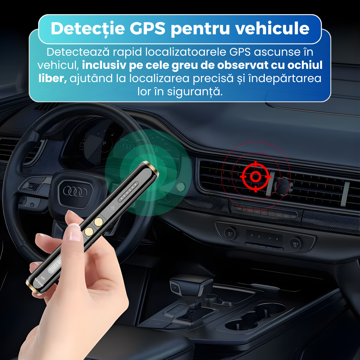 Dispozitivul scaneaza semnale RF pe un spectru larg de frecvente, permitand detectarea microfoanelor spion, camerelor wireless si a localizatoarelor GPS ascunse. Este ideal pentru utilizare in autoturisme, unde pot fi instalate trackere fara stirea proprietarului.