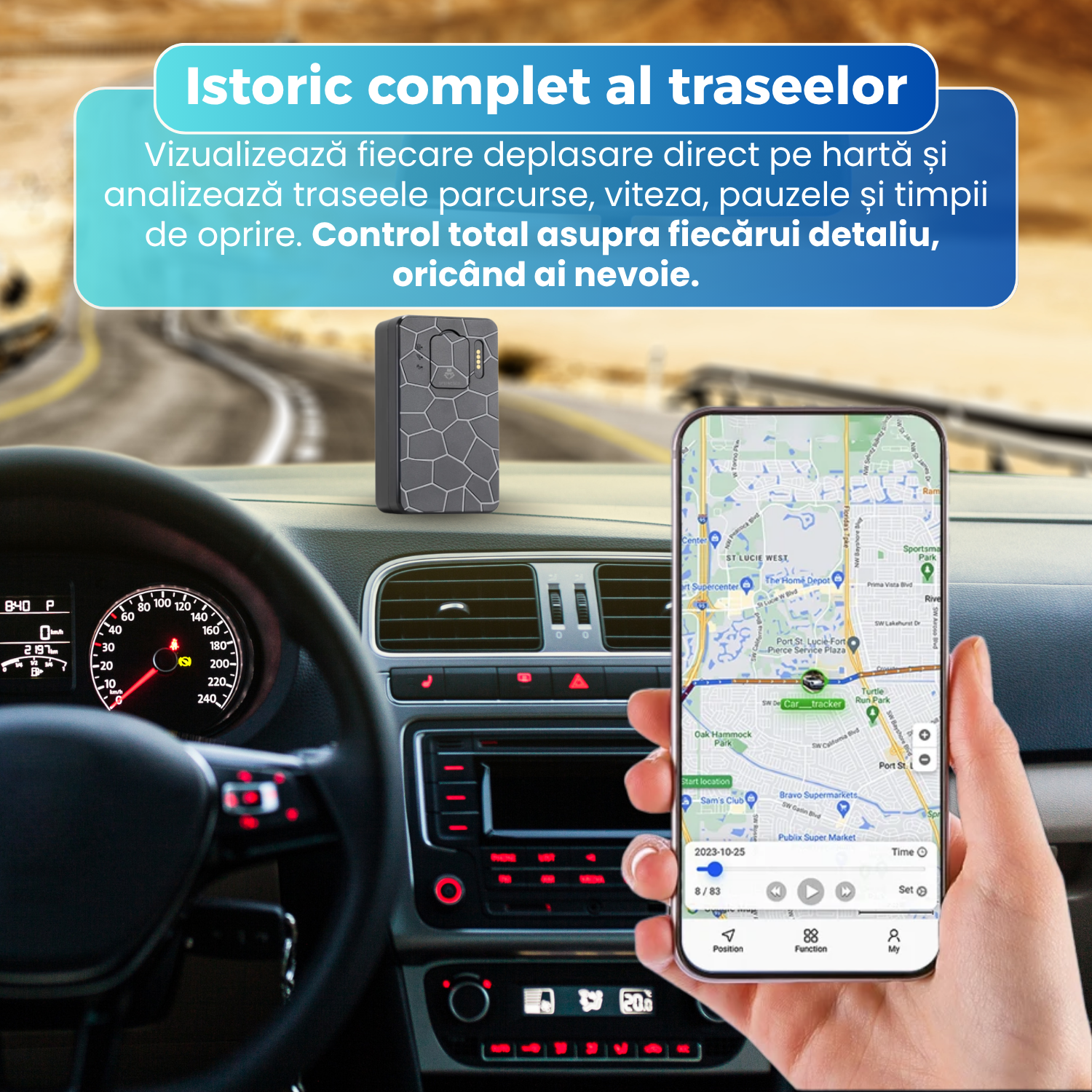 Redare traseu si istoric complet – Vizualizeaza deplasarile si timpii de oprire direct in aplicatia mobila.