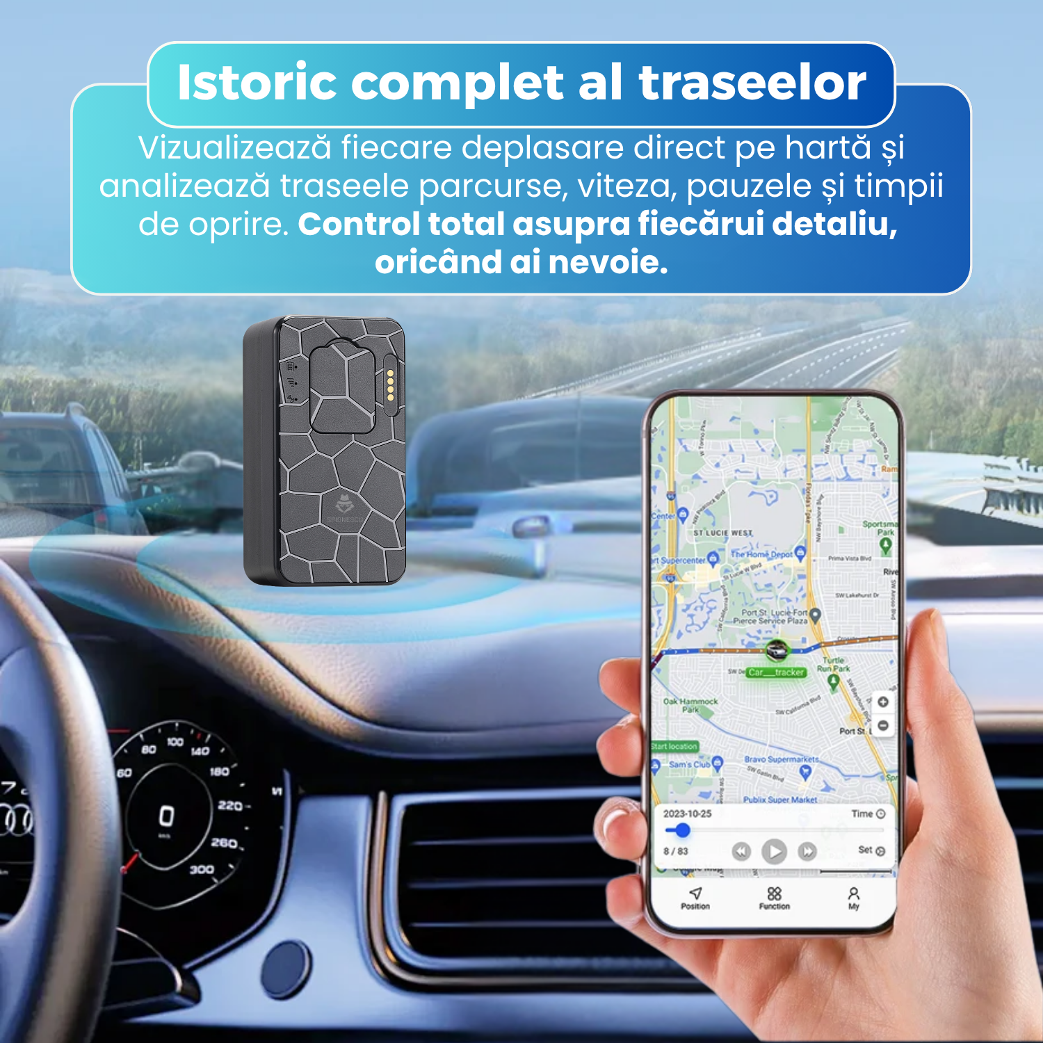 Redare traseu si istoric complet – Vizualizeaza deplasarile si timpii de oprire direct in aplicatia mobila.