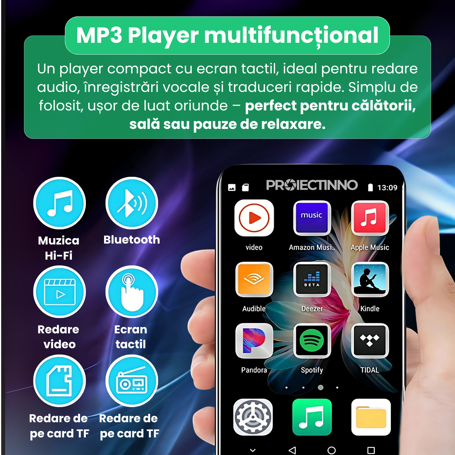 Acest MP3 player portabil cu ecran tactil de 4 inch este mai mult decat un simplu dispozitiv audio. Cu sistem de operare Android, memorie RAM de 2GB, stocare interna de 16GB si slot pentru card TF, ofera functionalitati avansate intr-un format compact si elegant. Este solutia ideala pentru redarea muzicii si videoclipurilor, navigare online prin Wi-Fi, conectare rapida prin Bluetooth 5.0 si multe alte functii multimedia.