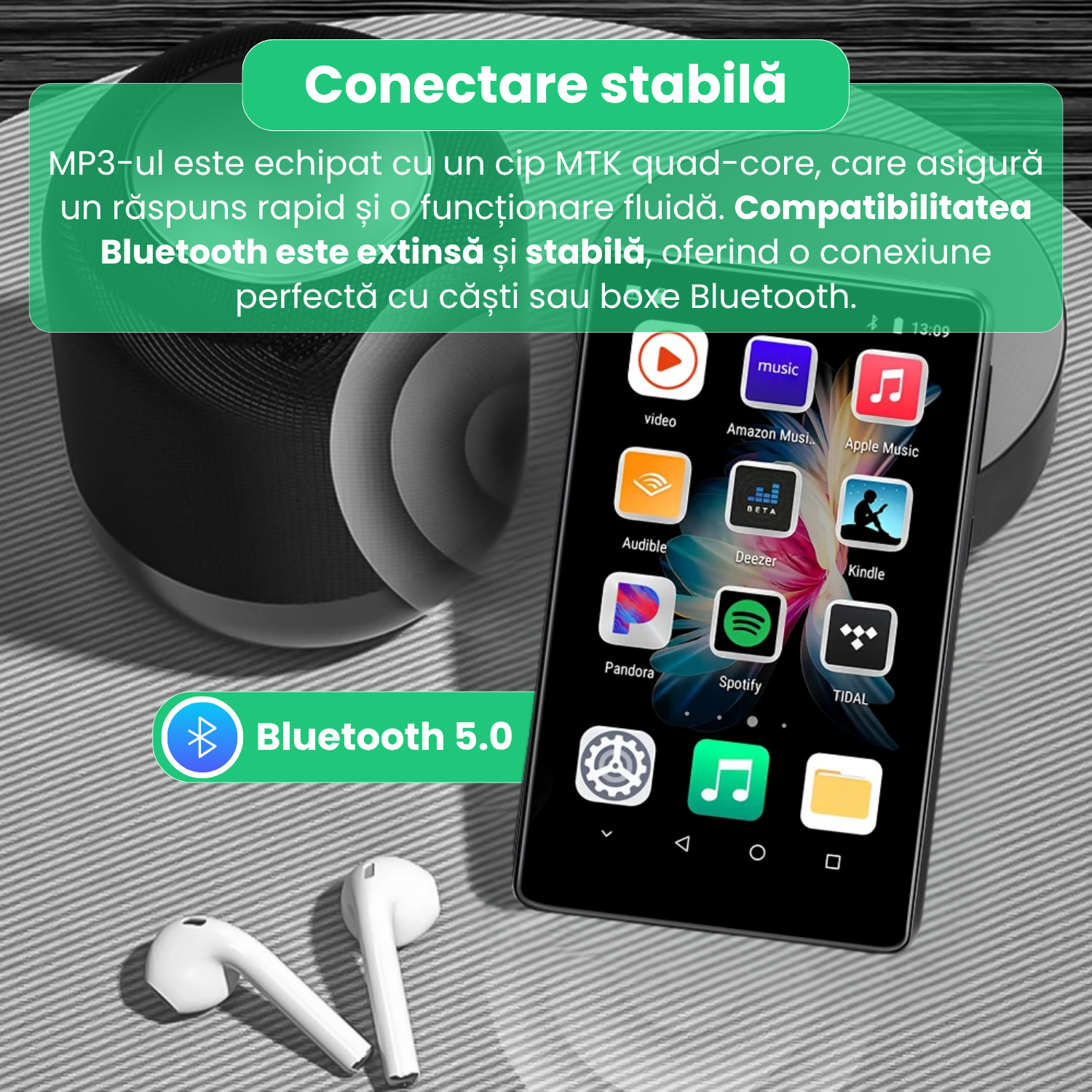 Bluetooth 5.0 asigura o conexiune fara intreruperi si cu latenta redusa, ideala pentru ascultarea muzicii prin casti wireless sau pentru conectarea la boxe portabile. Modul Wi-Fi iti permite accesarea rapida a internetului pentru actualizari, streaming sau descarcarea fisierelor direct pe dispozitiv.