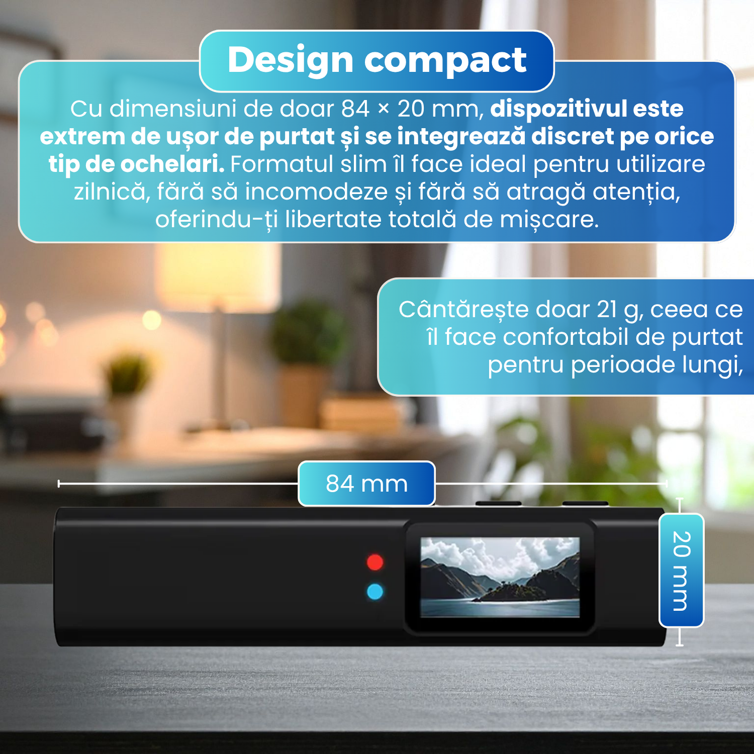 Avand doar 21 g, dispozitivul este incredibil de usor, ceea ce il face confortabil chiar si pentru utilizare indelungata. Nu incarca rama ochelarilor, nu incomodeaza si nu provoaca disconfort in timpul activitatilor. Greutatea redusa este perfecta pentru utilizatorii care vor discretie si libertate de miscare, fara senzatia ca poarta un dispozitiv suplimentar.