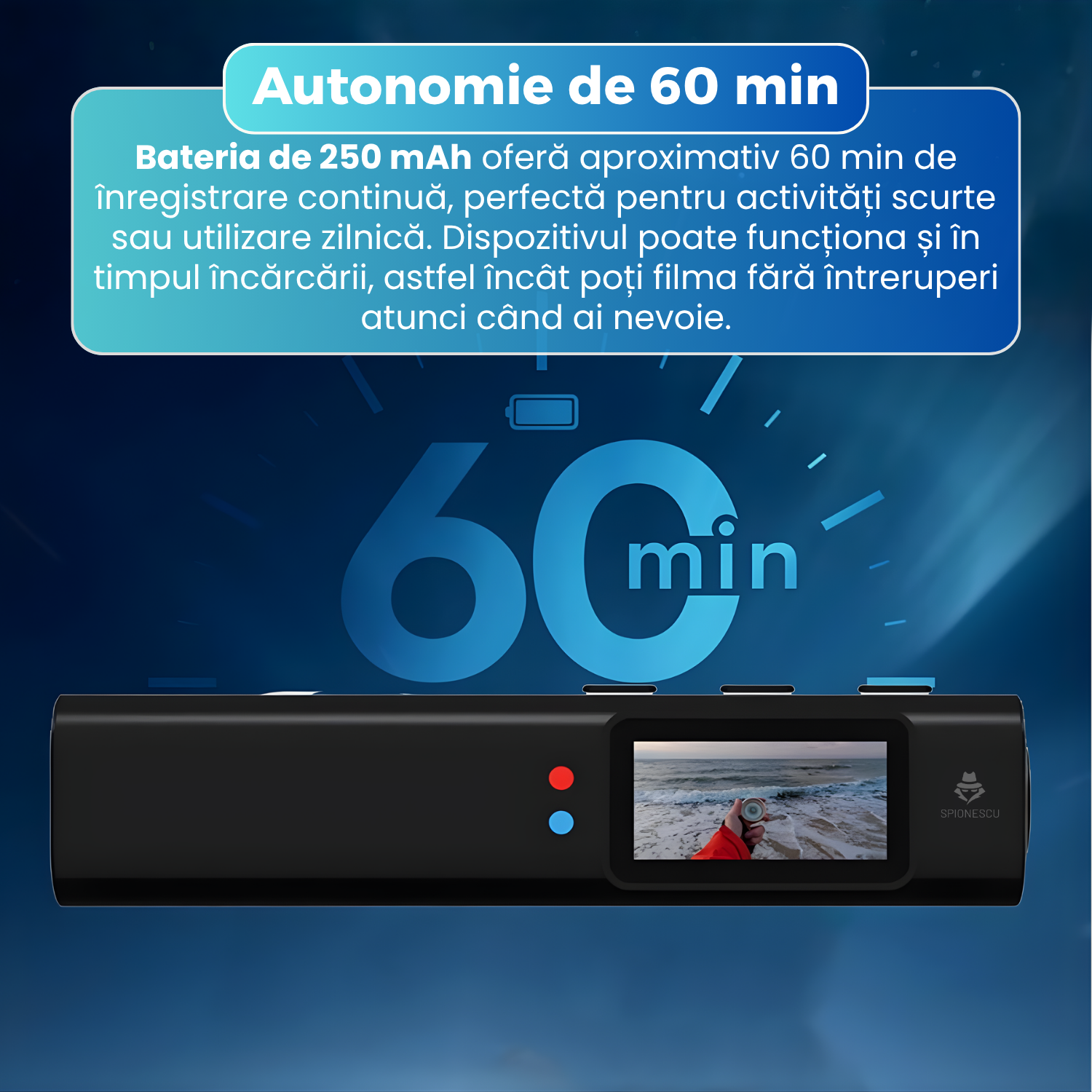 Dispozitivul este dotat cu o baterie de 250 mAh care asigura aproximativ 1 ora de filmare continua, suficienta pentru activitati scurte, drumuri zilnice, vloguri rapide sau experiente spontane. Pentru utilizatorii care au nevoie de filmare extinsa, camera poate functiona si in timpul incarcarii printr-o baterie externa sau adaptor, ceea ce inseamna ca poti continua inregistrarea fara pauze si fara riscul de a pierde momente importante.