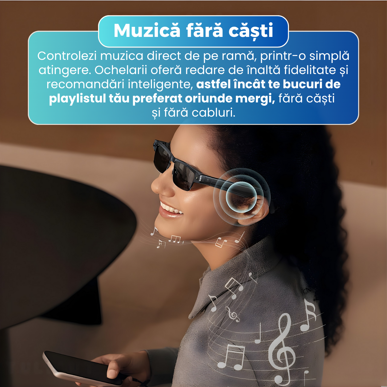 Echipati cu un microfon de inalta sensibilitate si tehnologie de reducere a zgomotului, ochelarii asigura apeluri clare si stabile chiar si in medii zgomotoase sau in timpul deplasarii. Sistemul inteligent filtreaza sunetele de fundal si amplifica vocea, astfel incat interlocutorul te aude cu precizie, iar conversatia ramane cursiva. Printr-o simpla atingere pe rama poti raspunde la apeluri, poti inchide conversatia sau poti initia comenzi vocale. Faptul ca mainile raman complet libere iti ofera siguranta sporita la volan, libertate in timpul activitatilor sportive si confort atunci cand ai mainile ocupate. Pentru profesionisti, calatori sau persoane active, aceasta functie devine rapid indispensabila.