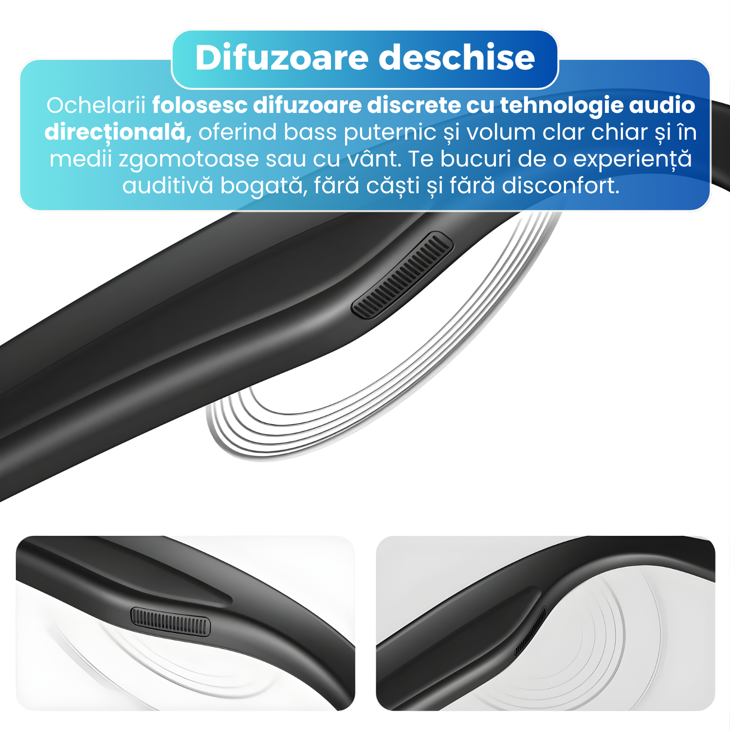 Difuzoarele deschise integrate sunt concepute special pentru a directiona sunetul direct catre urechi, fara a bloca zgomotele ambientale sau a izola complet mediul inconjurator. Aceasta tehnologie moderna combina siguranta cu libertatea de ascultare, astfel incat te poti bucura de muzica preferata in timp ce ramai atent la ceea ce se intampla in jurul tau. Sunetul este clar, echilibrat si spatios, iar bass-ul este extins si bine definit, oferind o experienta premium chiar si in zone aglomerate sau in conditii de vant. Spre deosebire de castile traditionale, ochelarii nu provoaca disconfort la purtare, nu apasa urechea si nu necesita cabluri sau accesorii suplimentare. Sunt perfecti pentru plimbari, condus, activitati sportive, lucru la birou sau relaxare, oferind o experienta audio bogata si naturala.