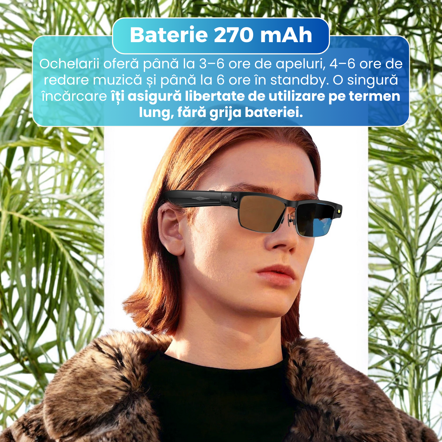 Ochelarii sunt echipati cu o baterie optimizata care ofera intre 3 si 6 ore de convorbiri continue, intre 4 si 6 ore de redare muzica si pana la 6 ore standby. Aceasta autonomie ridicata permite utilizarea zilnica fara grija incarcarii frecvente, iar modul standby inteligent pastreaza energia atunci cand nu sunt folositi activ. Dispozitivul este proiectat pentru stiluri de viata dinamice, fiind perfect pentru calatorii, sport, munca pe teren sau utilizare prelungita in mediul urban.