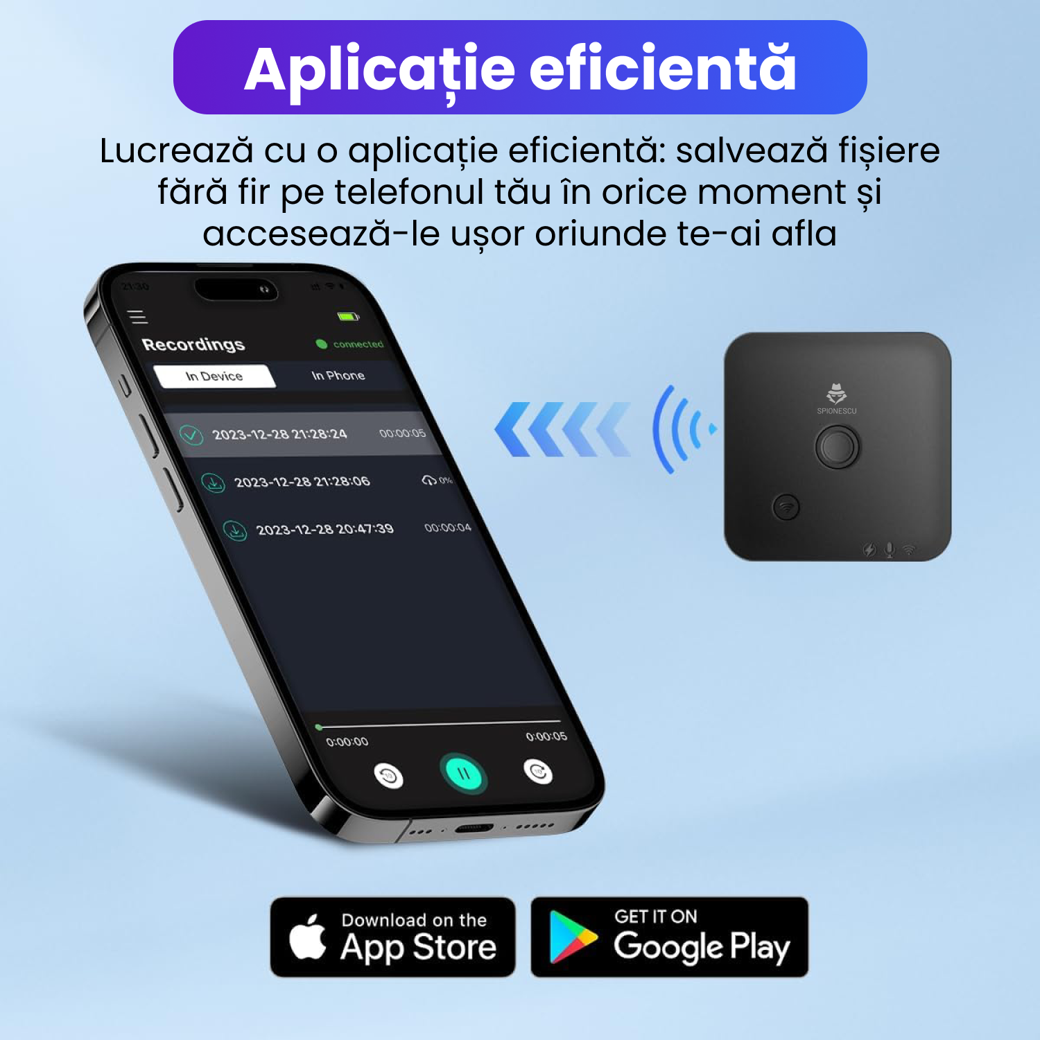 Control simplificat prin aplicatie: Gestionati toate functiile reportofonului direct de pe telefonul dumneavoastra prin aplicatia dedicata. Acest lucru va permite sa accesati si sa organizati inregistrarile rapid si usor, de oriunde.