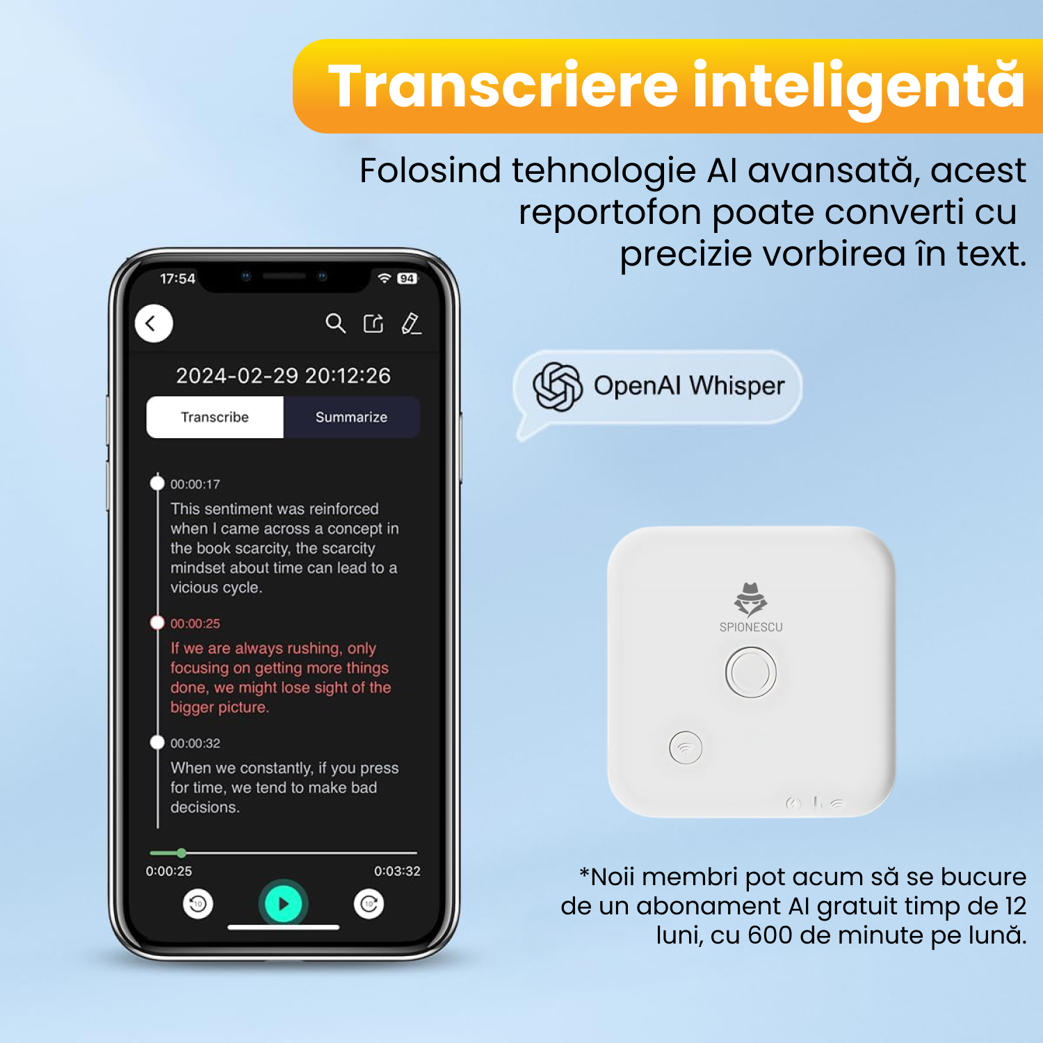Reportofonul Inteligent cu tehnologia GPT-4 redefineste modul in care interactionezi cu informatiile inregistrate, oferind o experienta de utilizare fara precedent. Prin integrarea avansata a GPT-4, acest dispozitiv este capabil sa extraga rapid si precis esentialul fiecarei inregistrari, transformandu-le intr-un rezumat clar si detaliat in doar 1 minut. Cu ajutorul acestei tehnologii inovatoare, nu doar ca vei beneficia de inregistrari precise si organizate, dar vei economisi si timp pretios, evitand procesul laborios de transcriere manuala. Indiferent daca esti intr-o intalnire de afaceri, in cadrul unei conferinte sau in mijlocul unei sesiuni de brainstorming, acest reportofon iti ofera instrumentele necesare pentru a capta si organiza informatiile esentiale, facilitand gestionarea eficienta a acestora. Cu un design elegant si functionalitati de varf, este solutia ideala pentru profesionistii care doresc sa optimizeze fluxul de lucru si sa mentina un nivel inalt de productivitate.