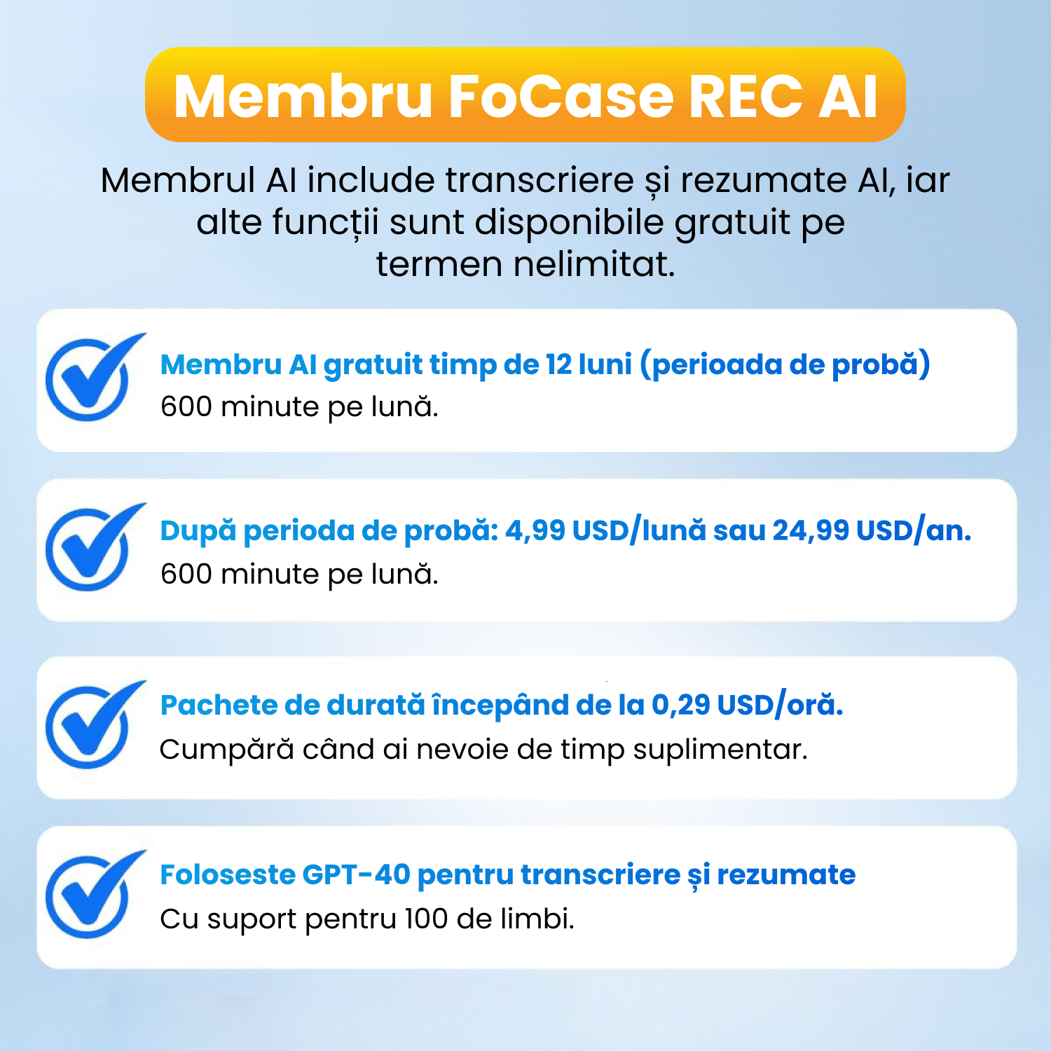 Ca membru FoCase REC AI, ai acces la o gama completa de functionalitati avansate care transforma modul in care gestionezi si utilizezi informatiile inregistrate. Beneficiezi de tehnologia de transcriere si rezumate bazata pe AI, care utilizeaza algoritmi de varf pentru a converti rapid si precis fiecare inregistrare in text. Acest proces nu doar ca iti economiseste timp, dar iti ofera si un rezumat detaliat al continutului, astfel incat sa poti accesa esentialul fara a fi nevoie sa parcurgi intreaga inregistrare. In plus, ca membru, ai la dispozitie toate celelalte functii oferite de platforma gratuit pe termen nelimitat. Aceasta inseamna ca poti explora si utiliza toate instrumentele si optiunile disponibile fara a fi restrictionat de limitari temporale sau costuri suplimentare. De la functii de organizare a inregistrarilor, pana la optiuni de partajare si personalizare, totul este la indemana ta pentru a-ti imbunatati eficienta si a-ti maximiza productivitatea. FoCase REC AI este conceput pentru a raspunde nevoilor profesionale si personale, oferind o solutie completa pentru captarea, organizarea si analiza informatiilor. Indiferent daca esti un profesionist care doreste sa optimizeze procesele de lucru sau cineva care cauta un instrument de inalta performanta pentru uz personal, acest membru iti ofera toate resursele necesare pentru a gestiona informatiile intr-un mod inteligent si eficient.