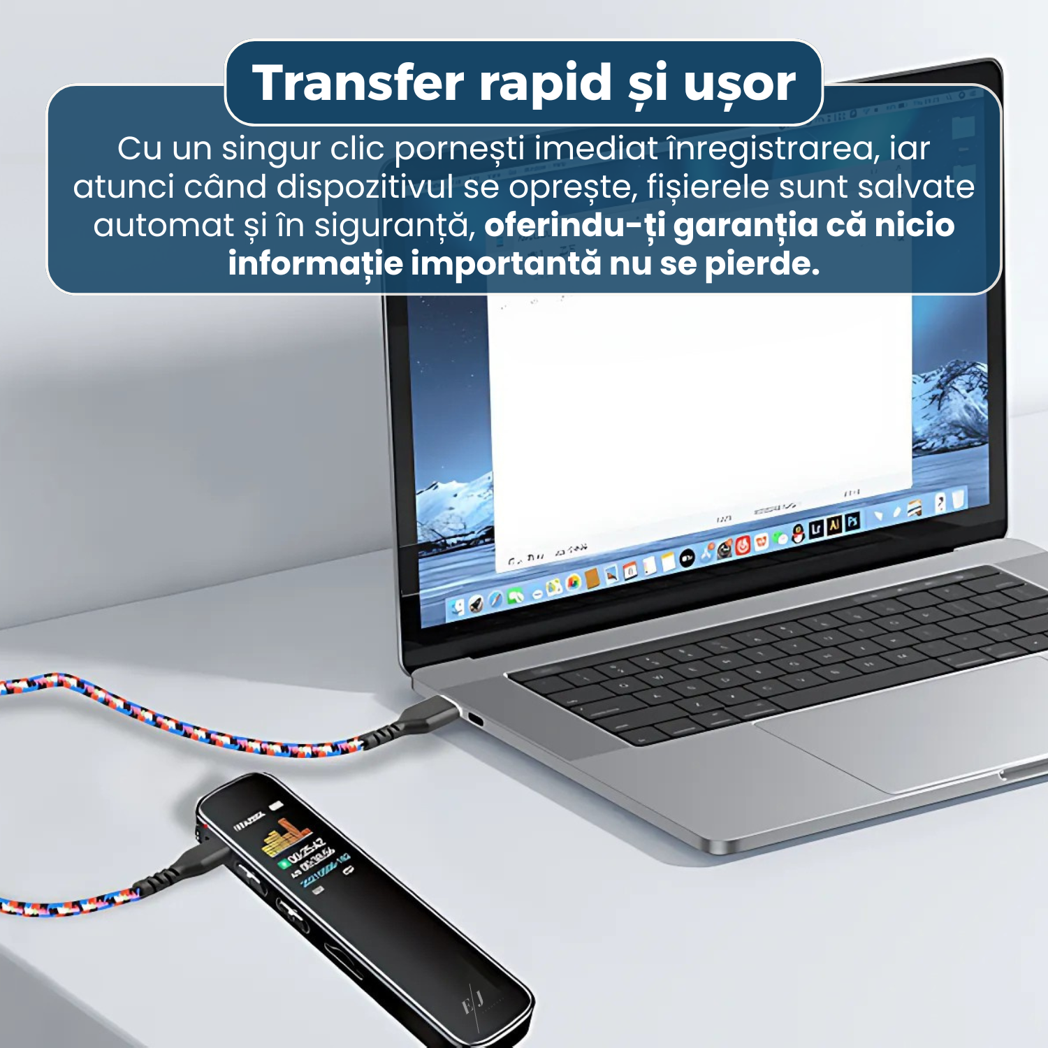 Conecteaza reportofonul la computer prin cablul Micro USB inclus si transfera fisierele audio in doar cateva secunde. Procesul este simplu, fara setari suplimentare, oferindu-ti acces imediat la inregistrari pentru redare, editare sau arhivare.