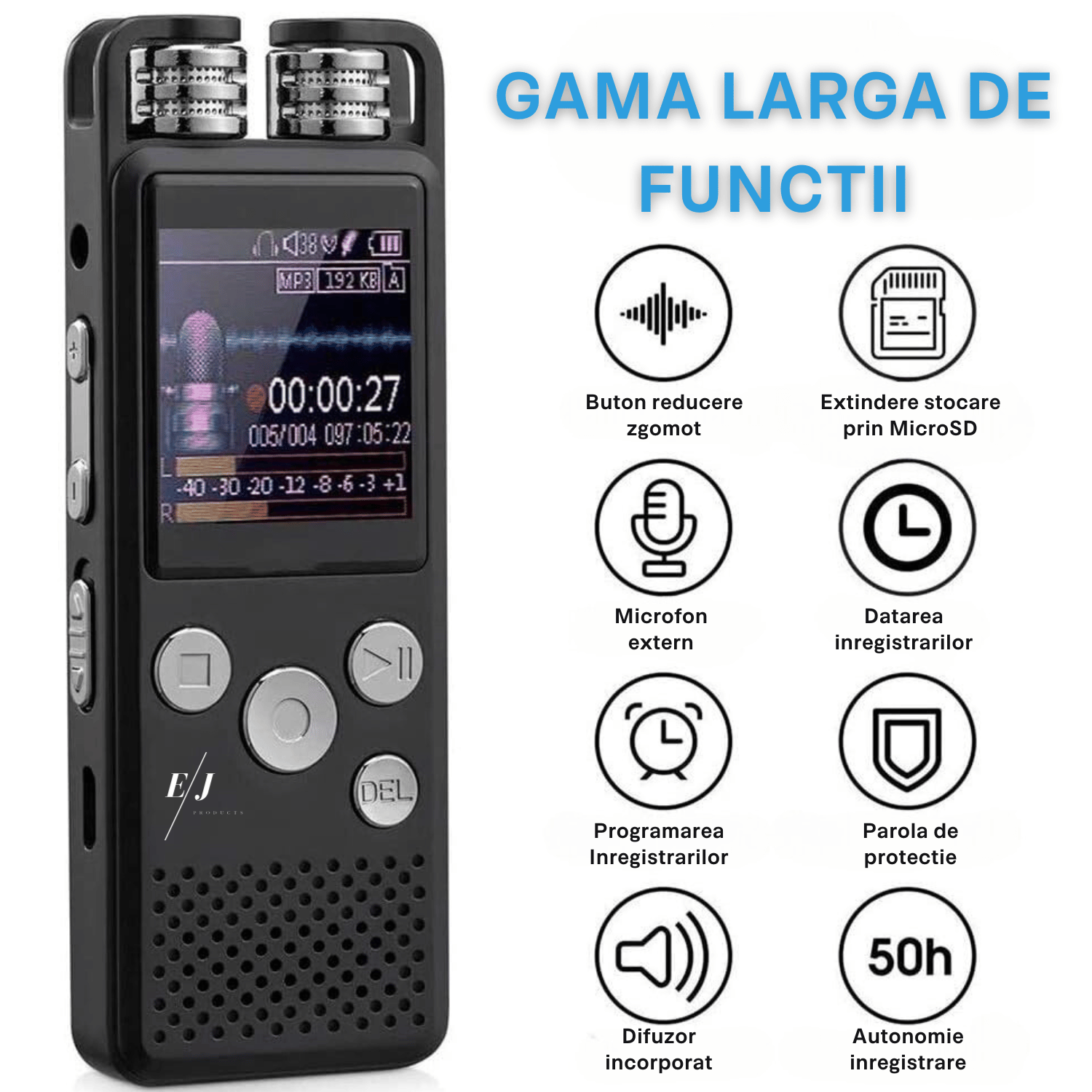 Difuzor Incorporat: Redati inregistrarile direct de pe dispozitiv cu difuzorul puternic incorporat. Ascultati imediat materialele inregistrate, cu claritate si volum impresionant, fara necesitatea unor dispozitive suplimentare.