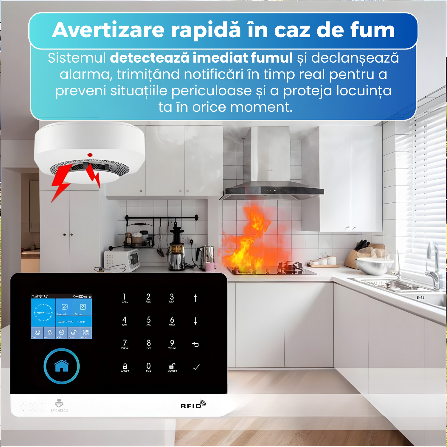 Prin conectarea detectoarelor de fum, monoxid de carbon sau gaz, sistemul iti ofera un nivel suplimentar de siguranta. Vei fi notificat imediat in caz de incendiu sau scurgere de gaz, prevenind situatii periculoase si oferind timp de reactie.
