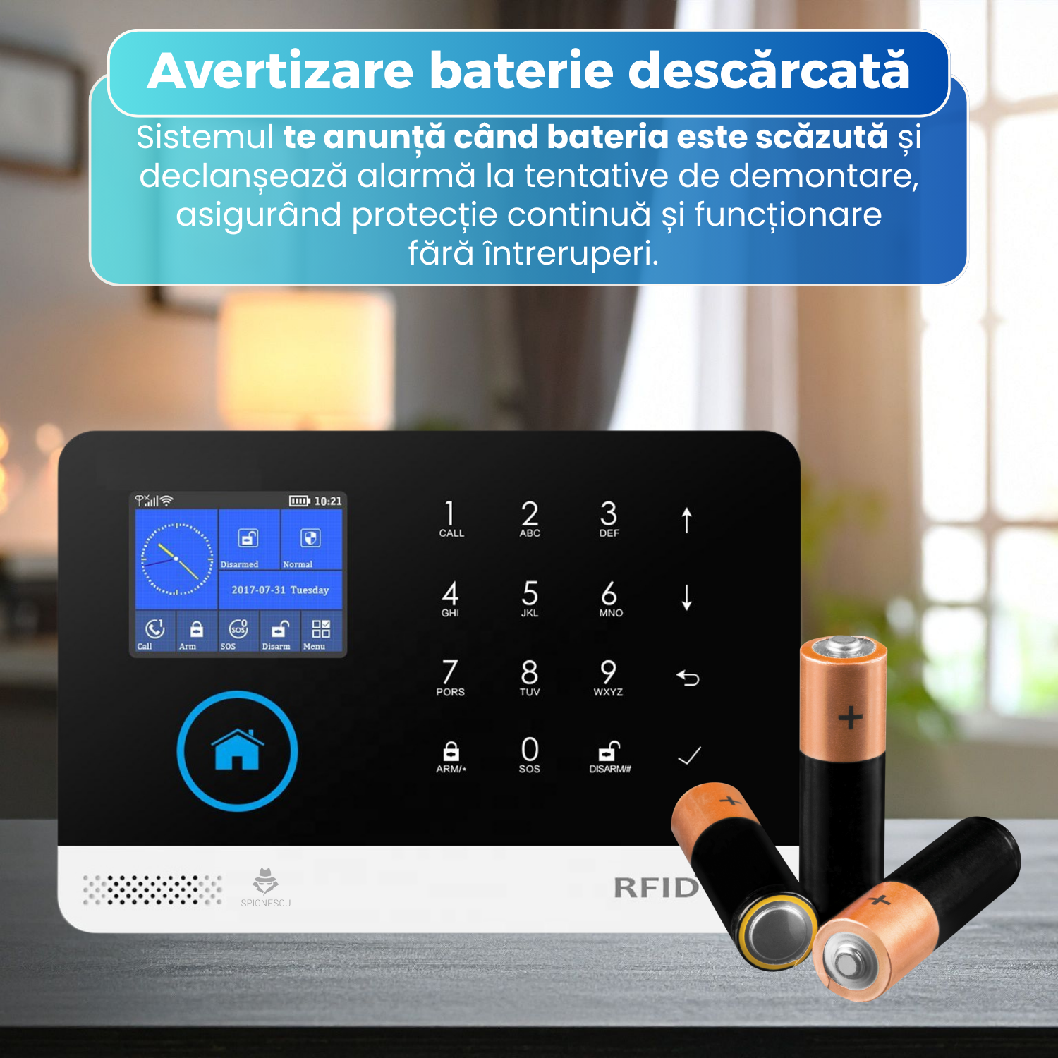 Sistemul te avertizeaza din timp atunci cand nivelul bateriei este scazut si declanseaza alarma in cazul tentativelor de demontare, asigurand functionare continua si siguranta sporita.
