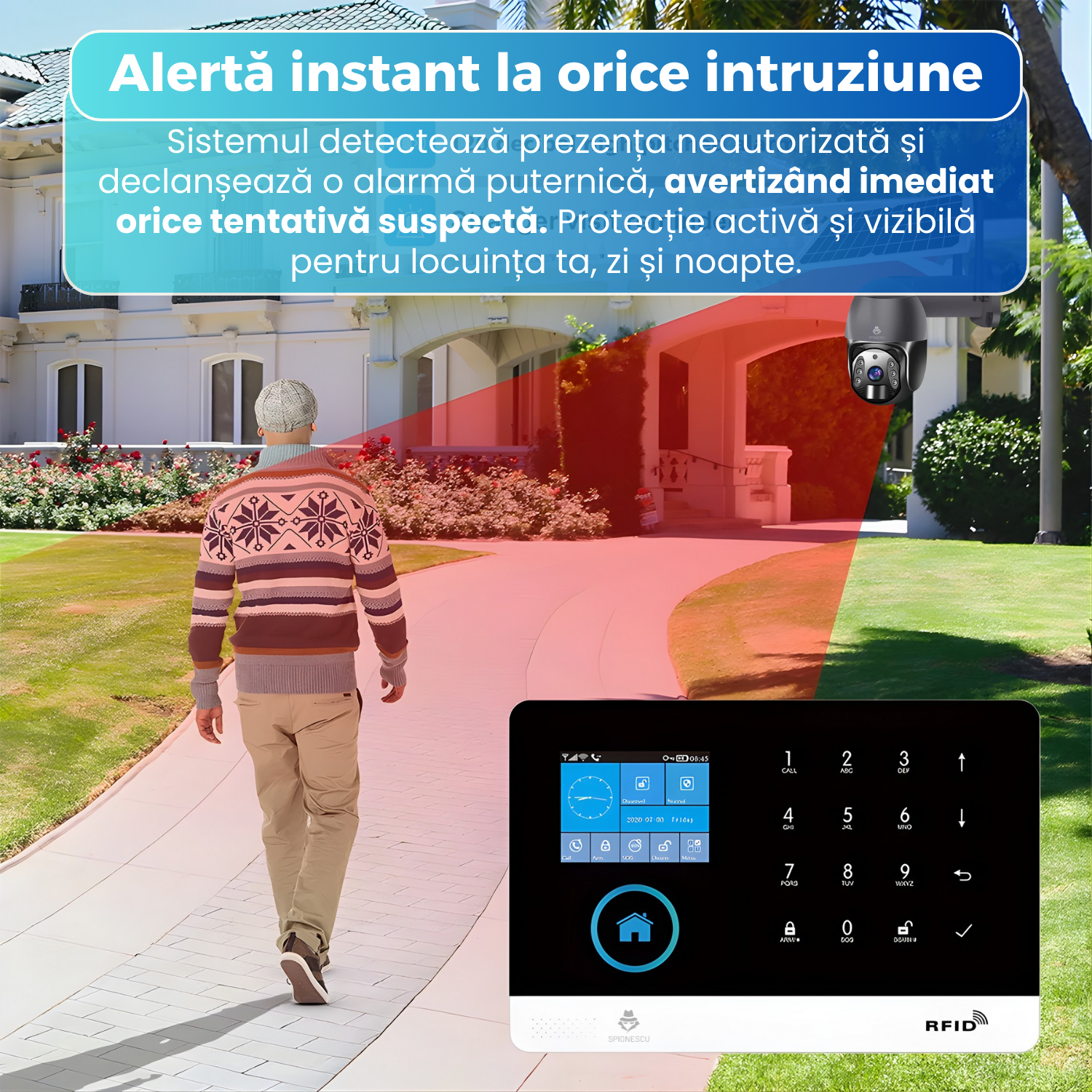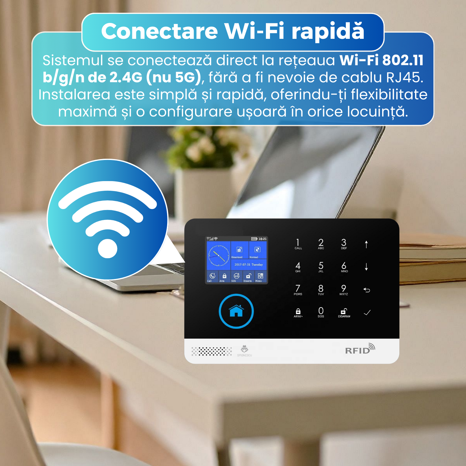 Sistemul functioneaza atat prin WiFi, cat si prin reteaua GSM, oferind stabilitate sporita. Daca nu exista conexiune WiFi sau aceasta este instabila, sistemul continua sa functioneze prin cartela SIM, mentinand protectia activa.