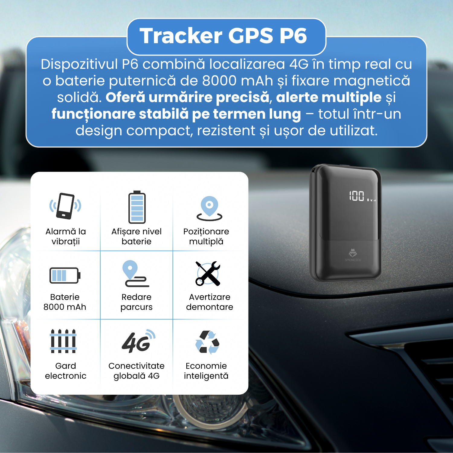Tracker GPS P6, 4G, magnet puternic, baterie 8000 mAh, alerte multiple, gard electronic si pozitionare multipla GPS + WiFi + LBS + BD, redare parcurs
